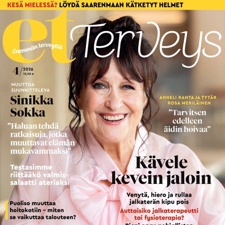 Osallistu ET Terveys -lehden 4/2026 paras juttu? Vastaa ja voita! Osallistu ET Terveysristikko 4/26 Vastaa ja voita! Ihmiset Parkinsonin tautiis sairastunut Juha: ”Otan vastaan sen, mitä eteen tulee” Puoliso haluaisi seksiä – eikö halaaminen ja suukottelu riittäisi? Ihmiset Riitta Uosukaisen Topi-puoliso menehtyi Alzheimeriin: ”Koko ajan se tuntui kipeältä, mutta toinen oli kuitenkin vielä läsnä” Kilpailut Mikä on ET-lehden 7/2026 paras juttu? Vastaa ja voita! Matkaopas Kesän ihanina lähiloma: Tukholman uudet löydöt, länsirannikon rapusafari ja yli sata muuta vinkkiä Ruotsiin MAINOS Koivistolaisten Anneli, 82: ”Jouduin vähentämään työtekoa, kun mieheni sairastui” Suuri muutos virallisissa kirjeissä – tunnetko jo sähköisen postilaatikon? Sisältö jatkuu mainoksen alla Suosituimmat Ruoka Ohrainen hiivaleipä eli rievä Käsityöt Virkkaa iki-ihana ET-kesäkassi Terveys Näin hoidat nivelrikkoa oikein kotona Piha & puutarha Näin leikkaat orapihlaja-aidasta kauniin Käsityöt Ompele kaunis kesämekko Terveys Onko paastosta hyötyä vai haittaa? Kaksi asiantuntijaa vastaa Raha Kysy lakiasioista! ET-lehden perhejuristi Katariina Kuusiluoma vastaa Kysy asiantuntijalta! Terveys Kysy terveydestä! ET-lehden omalääkäri Risto Laitila vastaa Kysy asiantuntijalta! Lämmintä langoista Varpaat lämpimään: Tee kauniit konttineulesukat Tee itse somat perinnelapaset: 17 maakuntaa, 17 ohjetta Varaudu viimaa vastaan! Virkkaa hieno tupsupipo Neulo ihana jättineulospipo trendiväristä – ota ohje talteen Virkkaa ihana plussapeitto! Neulo ruutusukat Maikin malliin Hyödynnä vanha villatakki – ompele tyynynpäällinen neule- ja samettitilkuista Neulo kätevät ja kauniit läppälapaset Väriä olohuoneeseen! Virkkaa ihania afrikankukkia ja kokoa ne huovaksi Neulo kaunis pitsihuivi Muistatko Tankki täyteen -sarjan? Näin neulot helpon Sulo Vilén -pipon Neulo vauvalle ihanat piparkakkusukat Neulo talveksi kaunis kirjoneuletakki Neulo hehkuva palmikkoneulehuppu Virkkaa torkkupeitto ja neulo putkisukat Neulo pehmoinen villahuppari mummon kullalle Sisältö jatkuu mainoksen alla ET Terveys Kirjailija Leena Lehtolainen on transtyttären äiti: ”Toivon, että osaan tukea lastani oikealla tavalla” Näyttelijä Kati Outinen, 64: ”Kalenteri on totuudellisempi kuin päiväkirja” Laulaja Tarja Ylitalo, 74: ”Olen löytänyt elämisen ilon uudelleen” Toimittaja Hilla Blomberg, 66: ”Eläkkeelle jäätyäni ryhdyin toimistomummoksi” Suuta kuivaa! Löytyykö syyllinen lääkekaapista? Näyttelijä Seela Sella, 88: ”Sairauskohtauksen jälkeen tein heti sen virheen, jota ei pitäisi tehdä” Uinnin jälkeen kutittaa kamalasti - voisiko se olla järvisyyhyä? Näyttelijä Liisamaija Laaksonen, 87: ”Ryhdyin kirjoittamaan, koska minua otti niin päähän, että naisten roolit alkoivat loppua” Nivelpsoriasikseen sairastunut Eija, 61: ”Lääkkeen avulla pääsin elämään kiinni” Keikahtiko tyroksiiniarvo? Vaikka kilppari kiukuttelee, aina ei ole syytä huoleen Salliiko lääkäri iltahömpsyn? Voisiko se olla uniapneaa? Aivoverenvuoto 56-vuotiaana muutti Pekan elämän pysyvästi: ”Harrastuksesta tuli elämänlanka” Mikä neuvoksi, kun huulet ja sormenpäät halkeilevat kuivuuttaan? Kaari Utrio: ”Isossa talossani saatan tuntea yksinäisyyttä, luonnossa en koskaan” Tiesitkö? Tämä pieni koje torjuu tehokkaasti muistisairautta Vapaa-aika Kiinnostaako ainutlaatuinen kokemus – vietä yö Finlandia-talossa Terveys Lukijan huoli: ”Mokasin muistitestissä ja nyt jokainen lääkäri näkee sen tiedoissani” Ihmiset Vaihdevuosioireista kärsinyt Susanna Haavisto: ”Jos suoraan sanon, minusta tuli vittumainen ämmä.” Näyttelijä Erja Manto: ”Synkkinä päivinä kirkasvalolamppu palaa aamusta iltaan” Rakastetuimmat tarinat 101-vuotias Elli asuu yksin: ”Viikonloput vietän miesystäväni luona” Parisuhdekouluttaja Marianna Stolbow: ”Lapsuus vaikuttaa siihen, keneen rakastumme” Väärän diagnoosin saanut Teija löysi ilon pyörätuolitanssista: ”Kun musiikki alkaa soida, unohdan kaiken muun” Poliisipastori Carita Pohjolan-Pirhonen: ”On menetyksiä, joista ei toivu koskaan” Maajussista moniosaajaksi Tosimiesten kylä Isän ja pojan maitotilalla lehmä saa tulla tupaan: ”Kun viiliästi ottaa niin pääsee helpommalla” Kari jätti ahdistavan uskonyhteisön: "Kävin elokuvissa ensimmäistä kertaa 52-vuotiaana" Riitta asuu lähes erakkona mökissään: ”Täällä pysyn paremmassa kunnossa kuin rivitalossa” Paula Koivuniemen, 70, mielestä paras elämä alkaa viisikymppisenä: "Enää ei tarvitse esittää mitään" Raija Auvinen menetti miehensä ja poikansa äkillisesti: "Tyttären kuolemaa en enää kestäisi" Arvo palasi rakkaaseen Antreaan: ”Sain synnyinkotini takaisin ilmaiseksi” Yksin omasta halustaan - tällaista on Annan eläkeaika saarella Televisiosta tuttu Jaakko Selin jätti vehnän pois: "Näin lähti äijämaha" Matti, 76, asuu kahdestaan Down-poikansa Pertin kanssa: "Onni on pienissä asioissa" Kaisa Liski selvisi vuosien parisuhdeväkivallasta: "Nyt minulla on oikea elämä" Käsityöt Tee itse somat perinnelapaset: 17 maakuntaa, 17 ohjetta Osallistu ja voita ET Terveys -lehden 4/2026 paras juttu? ET Terveysristikko 4/26 Mikä on ET-lehden 7/2026 paras juttu? Pian Tapio Lehtinen, 64, viettää monta kuukautta yksin purjeveneessään Matkaoppaan kuvakisa: Lähetä kuva hotellihuoneen sängystä ja voita mariskooli! Matkaoppaan kuvakisa: Lähetä kuva aalloista ja voita Mariskooli! Matkaoppaan kuvakisa: Lähetä kuva erikoisesta hiekasta ja voita Mariskooli! Matkaoppaan kuvakisa: Lähetä kuva erikoisesta rakennuksesta ja voita Mariskooli! Matkaoppaan kuvakisa: Lähetä kuva maisemasta ja voita Mariskooli! Matkaoppaan kuvakisa: Lähetä kuva taivaasta ja voita Mariskooli! Matkaoppaan kuvakisa: Lähetä kuva lomasäästä ja voita Scent of Finland -tuoksu! Matkaoppaan kuvakisa: Lähetä kuva suomalaise