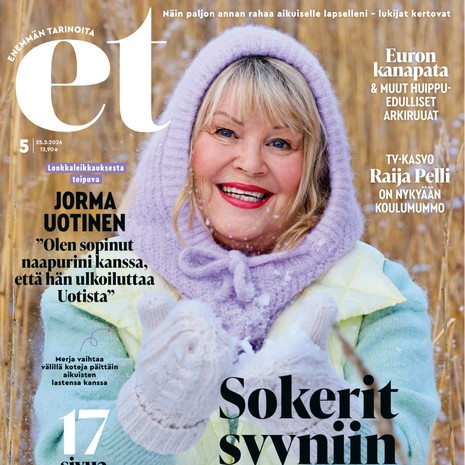 Ihmiset Vaihdevuosioireista kärsinyt Susanna Haavisto: ”Jos suoraan sanon, minusta tuli vittumainen ämmä.” Kilpailut Mikä on ET-lehden 5/2026 paras juttu? Vastaa ja voita! Näyttelijä Erja Manto: ”Synkkinä päivinä kirkasvalolamppu palaa aamusta iltaan” Omaishoitaja, millaisesta tuesta tai oivalluksesta on ollut sinulle eniten hyötyä? Ihmiset Muistisairauden saanut Erja Häkkinen, 64: ”Kalenteri muistaa nyt puolestani” Terveys Pitääkö matalasta verenpaineesta huolestua? Hannun, 77, tila romahti sairaalassa: ”Katselin katonrajasta, kun minua elvytettiin” Terveys Mummin huoli: ”Miksi keskustelu lapsenlapsen kanssa meni taas riitelyksi?” Näyttelijä Kati Outinen, 64: ”Kalenteri on totuudellisempi kuin päiväkirja” Sisältö jatkuu mainoksen alla Suosituimmat Käsityöt Virkkaa iki-ihana ET-kesäkassi Terveys Näin hoidat nivelrikkoa oikein kotona Piha & puutarha Näin leikkaat orapihlaja-aidasta kauniin Käsityöt Ompele kaunis kesämekko Terveys Onko paastosta hyötyä vai haittaa? Kaksi asiantuntijaa vastaa Ruoka Chilin ja inkiväärin tuoksua! Nyt herkutellaan jättikatkaravuilla Raha Kysy lakiasioista! ET-lehden perhejuristi Katariina Kuusiluoma vastaa Kysy asiantuntijalta! Terveys Kysy terveydestä! ET-lehden omalääkäri Risto Laitila vastaa Kysy asiantuntijalta! Lämmintä langoista Varpaat lämpimään: Tee kauniit konttineulesukat Tee itse somat perinnelapaset: 17 maakuntaa, 17 ohjetta Varaudu viimaa vastaan! Virkkaa hieno tupsupipo Neulo ihana jättineulospipo trendiväristä – ota ohje talteen Virkkaa ihana plussapeitto! Neulo ruutusukat Maikin malliin Hyödynnä vanha villatakki – ompele tyynynpäällinen neule- ja samettitilkuista Neulo kätevät ja kauniit läppälapaset Väriä olohuoneeseen! Virkkaa ihania afrikankukkia ja kokoa ne huovaksi Neulo kaunis pitsihuivi Muistatko Tankki täyteen -sarjan? Näin neulot helpon Sulo Vilén -pipon Neulo vauvalle ihanat piparkakkusukat Neulo talveksi kaunis kirjoneuletakki Neulo hehkuva palmikkoneulehuppu Virkkaa torkkupeitto ja neulo putkisukat Neulo pehmoinen villahuppari mummon kullalle Sisältö jatkuu mainoksen alla ET Terveys Näyttelijä Kati Outinen, 64: ”Kalenteri on totuudellisempi kuin päiväkirja” Laulaja Tarja Ylitalo, 74: ”Olen löytänyt elämisen ilon uudelleen” Toimittaja Hilla Blomberg, 66: ”Eläkkeelle jäätyäni ryhdyin toimistomummoksi” Suuta kuivaa! Löytyykö syyllinen lääkekaapista? Näyttelijä Seela Sella, 88: ”Sairauskohtauksen jälkeen tein heti sen virheen, jota ei pitäisi tehdä” Uinnin jälkeen kutittaa kamalasti - voisiko se olla järvisyyhyä? Näyttelijä Liisamaija Laaksonen, 87: ”Ryhdyin kirjoittamaan, koska minua otti niin päähän, että naisten roolit alkoivat loppua” Nivelpsoriasikseen sairastunut Eija, 61: ”Lääkkeen avulla pääsin elämään kiinni” Keikahtiko tyroksiiniarvo? Vaikka kilppari kiukuttelee, aina ei ole syytä huoleen Salliiko lääkäri iltahömpsyn? Voisiko se olla uniapneaa? Aivoverenvuoto 56-vuotiaana muutti Pekan elämän pysyvästi: ”Harrastuksesta tuli elämänlanka” Mikä neuvoksi, kun huulet ja sormenpäät halkeilevat kuivuuttaan? Kaari Utrio: ”Isossa talossani saatan tuntea yksinäisyyttä, luonnossa en koskaan” Tiesitkö? Tämä pieni koje torjuu tehokkaasti muistisairautta Mikä neuvoksi, kun nukkuja höpisee ja vaeltaa unissaan? Osallistu Mikä on ET Terveys -lehden 2/2026 paras juttu? Vastaa ja voita! Osallistu ET Terveysristikko 2/26 Vastaa ja voita! Lukijan huoli: ”Voinko antaa tyttärelle apua velaksi?” Ihmiset Ystävyyssuhteiden uuvuttama 80-vuotias: ”Tarvitsen ympärilleni ihmisiä, joista saan energiaa” Rakastetuimmat tarinat 101-vuotias Elli asuu yksin: ”Viikonloput vietän miesystäväni luona” Parisuhdekouluttaja Marianna Stolbow: ”Lapsuus vaikuttaa siihen, keneen rakastumme” Väärän diagnoosin saanut Teija löysi ilon pyörätuolitanssista: ”Kun musiikki alkaa soida, unohdan kaiken muun” Poliisipastori Carita Pohjolan-Pirhonen: ”On menetyksiä, joista ei toivu koskaan” Maajussista moniosaajaksi Tosimiesten kylä Isän ja pojan maitotilalla lehmä saa tulla tupaan: ”Kun viiliästi ottaa niin pääsee helpommalla” Kari jätti ahdistavan uskonyhteisön: "Kävin elokuvissa ensimmäistä kertaa 52-vuotiaana" Riitta asuu lähes erakkona mökissään: ”Täällä pysyn paremmassa kunnossa kuin rivitalossa” Paula Koivuniemen, 70, mielestä paras elämä alkaa viisikymppisenä: "Enää ei tarvitse esittää mitään" Raija Auvinen menetti miehensä ja poikansa äkillisesti: "Tyttären kuolemaa en enää kestäisi" Arvo palasi rakkaaseen Antreaan: ”Sain synnyinkotini takaisin ilmaiseksi” Yksin omasta halustaan - tällaista on Annan eläkeaika saarella Televisiosta tuttu Jaakko Selin jätti vehnän pois: "Näin lähti äijämaha" Matti, 76, asuu kahdestaan Down-poikansa Pertin kanssa: "Onni on pienissä asioissa" Kaisa Liski selvisi vuosien parisuhdeväkivallasta: "Nyt minulla on oikea elämä" Käsityöt Tee itse somat perinnelapaset: 17 maakuntaa, 17 ohjetta Osallistu ja voita Mikä on ET-lehden 5/2026 paras juttu? Mikä on ET Terveys -lehden 2/2026 paras juttu? ET Terveysristikko 2/26 Ristikkoekstra 1/2026 Pian Tapio Lehtinen, 64, viettää monta kuukautta yksin purjeveneessään Matkaoppaan kuvakisa: Lähetä kuva hotellihuoneen sängystä ja voita mariskooli! Matkaoppaan kuvakisa: Lähetä kuva aalloista ja voita Mariskooli! Matkaoppaan kuvakisa: Lähetä kuva erikoisesta hiekasta ja voita Mariskooli! Matkaoppaan kuvakisa: Lähetä kuva erikoisesta rakennuksesta ja voita Mariskooli! Matkaoppaan kuvakisa: Lähetä kuva maisemasta ja voita Mariskooli! Matkaoppaan kuvakisa: Lähetä kuva taivaasta ja voita Mariskooli! Matkaoppaan kuvakisa: Lähetä kuva lomasäästä ja voita Scent of Finland -tuoksu! Matkaoppaan kuvakisa: Lähetä kuva suomalaisesta rantamaisemasta ja voita mariskooli! Matkaoppaan kuvakisa: Lähetä katuruokakuva matkaltasi ja voit