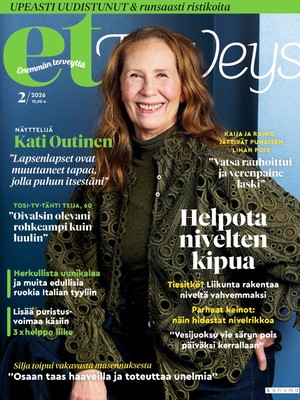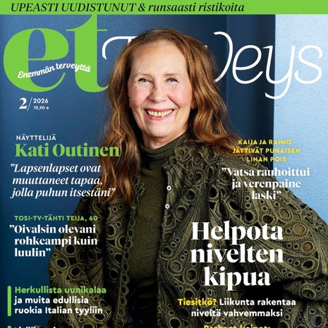 Osallistu Mikä on ET Terveys -lehden 2/2026 paras juttu? Vastaa ja voita! Osallistu ET Terveysristikko 2/26 Vastaa ja voita! Lukijan huoli: ”Voinko antaa tyttärelle apua velaksi?” Ihmiset Ystävyyssuhteiden uuvuttama 80-vuotias: ”Tarvitsen ympärilleni ihmisiä, joista saan energiaa” Ihmiset Elämän koulima Arja Saijonmaa, 81: ”Ei voi jäädä itsesääliin löllöttämään” Ihmiset Pirjon hiihtolomamatka sai yllätyslopun: ”Bussipysäkillä odotti karvalakkipäinen mies” Et ikinä arvaa keneen törmäsin Kilpailut Mikä on ET-lehden 3/2026 paras juttu? Vastaa ja voita! Terveys Kysy terveydestä! ET-lehden omalääkäri Risto Laitila vastaa Kysy asiantuntijalta! Ihmiset Eero, 79: ”Kari Tapio kirjoitti vaimolleni kortin hotellin aulassa” Et ikinä arvaa keneen törmäsin Sisältö jatkuu mainoksen alla Suosituimmat Käsityöt Ompele kaunis kesämekko Leivonta Ryynirieska savolaisittain Käsityöt Virkkaa iki-ihana ET-kesäkassi Terveys Näin hoidat nivelrikkoa oikein kotona Piha & puutarha Näin leikkaat orapihlaja-aidasta kauniin Terveys Onko paastosta hyötyä vai haittaa? Kaksi asiantuntijaa vastaa Raha Kysy lakiasioista! ET-lehden perhejuristi Katariina Kuusiluoma vastaa Kysy asiantuntijalta! Terveys Kysy terveydestä! ET-lehden omalääkäri Risto Laitila vastaa Kysy asiantuntijalta! Lämmintä langoista Varpaat lämpimään: Tee kauniit konttineulesukat Tee itse somat perinnelapaset: 17 maakuntaa, 17 ohjetta Varaudu viimaa vastaan! Virkkaa hieno tupsupipo Neulo ihana jättineulospipo trendiväristä – ota ohje talteen Virkkaa ihana plussapeitto! Neulo ruutusukat Maikin malliin Hyödynnä vanha villatakki – ompele tyynynpäällinen neule- ja samettitilkuista Neulo kätevät ja kauniit läppälapaset Väriä olohuoneeseen! Virkkaa ihania afrikankukkia ja kokoa ne huovaksi Neulo kaunis pitsihuivi Muistatko Tankki täyteen -sarjan? Näin neulot helpon Sulo Vilén -pipon Neulo vauvalle ihanat piparkakkusukat Neulo talveksi kaunis kirjoneuletakki Neulo hehkuva palmikkoneulehuppu Virkkaa torkkupeitto ja neulo putkisukat Neulo pehmoinen villahuppari mummon kullalle Sisältö jatkuu mainoksen alla ET Terveys Laulaja Tarja Ylitalo, 74: ”Olen löytänyt elämisen ilon uudelleen” Toimittaja Hilla Blomberg, 66: ”Eläkkeelle jäätyäni ryhdyin toimistomummoksi” Suuta kuivaa! Löytyykö syyllinen lääkekaapista? Näyttelijä Seela Sella, 88: ”Sairauskohtauksen jälkeen tein heti sen virheen, jota ei pitäisi tehdä” Uinnin jälkeen kutittaa kamalasti - voisiko se olla järvisyyhyä? Näyttelijä Liisamaija Laaksonen, 87: ”Ryhdyin kirjoittamaan, koska minua otti niin päähän, että naisten roolit alkoivat loppua” Nivelpsoriasikseen sairastunut Eija, 61: ”Lääkkeen avulla pääsin elämään kiinni” Keikahtiko tyroksiiniarvo? Vaikka kilppari kiukuttelee, aina ei ole syytä huoleen Salliiko lääkäri iltahömpsyn? Voisiko se olla uniapneaa? Aivoverenvuoto 56-vuotiaana muutti Pekan elämän pysyvästi: ”Harrastuksesta tuli elämänlanka” Mikä neuvoksi, kun huulet ja sormenpäät halkeilevat kuivuuttaan? Kaari Utrio: ”Isossa talossani saatan tuntea yksinäisyyttä, luonnossa en koskaan” Tiesitkö? Tämä pieni koje torjuu tehokkaasti muistisairautta Mikä neuvoksi, kun nukkuja höpisee ja vaeltaa unissaan? Olivatko tekonivelet ennen kestävämpiä? ET:n omalääkäri vastaa Ihmiset Erikoislääkäri Aarne Koskimies, 80: ”Hedelmöitys on aina ihme” Terveys Koko ajan palelee ja huimaa – olenko parantumattomasti sairas? Ihmiset Suomen EU-jäsenyydestä neuvotellut Pertti Salolainen, 85: ”He tekivät palveluksen Suomelle” Raha Kuolinpesästä on kavallettu omaisuutta – mitä voin tehdä? Rakastetuimmat tarinat 101-vuotias Elli asuu yksin: ”Viikonloput vietän miesystäväni luona” Parisuhdekouluttaja Marianna Stolbow: ”Lapsuus vaikuttaa siihen, keneen rakastumme” Väärän diagnoosin saanut Teija löysi ilon pyörätuolitanssista: ”Kun musiikki alkaa soida, unohdan kaiken muun” Poliisipastori Carita Pohjolan-Pirhonen: ”On menetyksiä, joista ei toivu koskaan” Maajussista moniosaajaksi Tosimiesten kylä Isän ja pojan maitotilalla lehmä saa tulla tupaan: ”Kun viiliästi ottaa niin pääsee helpommalla” Kari jätti ahdistavan uskonyhteisön: "Kävin elokuvissa ensimmäistä kertaa 52-vuotiaana" Riitta asuu lähes erakkona mökissään: ”Täällä pysyn paremmassa kunnossa kuin rivitalossa” Paula Koivuniemen, 70, mielestä paras elämä alkaa viisikymppisenä: "Enää ei tarvitse esittää mitään" Raija Auvinen menetti miehensä ja poikansa äkillisesti: "Tyttären kuolemaa en enää kestäisi" Arvo palasi rakkaaseen Antreaan: ”Sain synnyinkotini takaisin ilmaiseksi” Yksin omasta halustaan - tällaista on Annan eläkeaika saarella Televisiosta tuttu Jaakko Selin jätti vehnän pois: "Näin lähti äijämaha" Matti, 76, asuu kahdestaan Down-poikansa Pertin kanssa: "Onni on pienissä asioissa" Kaisa Liski selvisi vuosien parisuhdeväkivallasta: "Nyt minulla on oikea elämä" Käsityöt Tee itse somat perinnelapaset: 17 maakuntaa, 17 ohjetta Osallistu ja voita Mikä on ET Terveys -lehden 2/2026 paras juttu? ET Terveysristikko 2/26 Mikä on ET-lehden 3/2026 paras juttu? Ristikkoekstra 1/2026 Pian Tapio Lehtinen, 64, viettää monta kuukautta yksin purjeveneessään Matkaoppaan kuvakisa: Lähetä kuva hotellihuoneen sängystä ja voita mariskooli! Matkaoppaan kuvakisa: Lähetä kuva aalloista ja voita Mariskooli! Matkaoppaan kuvakisa: Lähetä kuva erikoisesta hiekasta ja voita Mariskooli! Matkaoppaan kuvakisa: Lähetä kuva erikoisesta rakennuksesta ja voita Mariskooli! Matkaoppaan kuvakisa: Lähetä kuva maisemasta ja voita Mariskooli! Matkaoppaan kuvakisa: Lähetä kuva taivaasta ja voita Mariskooli! Matkaoppaan kuvakisa: Lähetä kuva lomasäästä ja voita Scent of Finland -tuoksu! Matkaoppaan kuvakisa: Lähetä kuva suomalaisesta rantamaisemasta ja voita mariskooli! Matkaoppaan kuvakisa: Lähetä katuruo