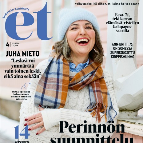 Osallistu Miltä eläkkeellä oleminen tuntuu? Ristikko Ristikko 4/2026 Vastaa ja voita! Kilpailut Mikä on ET-lehden 4/2026 paras juttu? Vastaa ja voita! Hannun, 77, tila romahti sairaalassa: ”Katselin katonrajasta, kun minua elvytettiin” Terveys Mummin huoli: ”Miksi keskustelu lapsenlapsen kanssa meni taas riitelyksi?” Näyttelijä Kati Outinen, 64: ”Kalenteri on totuudellisempi kuin päiväkirja” Osallistu Mikä on ET Terveys -lehden 2/2026 paras juttu? Vastaa ja voita! Osallistu ET Terveysristikko 2/26 Vastaa ja voita! Lukijan huoli: ”Voinko antaa tyttärelle apua velaksi?” Sisältö jatkuu mainoksen alla Suosituimmat Käsityöt Virkkaa iki-ihana ET-kesäkassi Terveys Näin hoidat nivelrikkoa oikein kotona Piha & puutarha Näin leikkaat orapihlaja-aidasta kauniin Käsityöt Ompele kaunis kesämekko Terveys Onko paastosta hyötyä vai haittaa? Kaksi asiantuntijaa vastaa Ruoka Chilin ja inkiväärin tuoksua! Nyt herkutellaan jättikatkaravuilla Raha Kysy lakiasioista! ET-lehden perhejuristi Katariina Kuusiluoma vastaa Kysy asiantuntijalta! Terveys Kysy terveydestä! ET-lehden omalääkäri Risto Laitila vastaa Kysy asiantuntijalta! Lämmintä langoista Varpaat lämpimään: Tee kauniit konttineulesukat Tee itse somat perinnelapaset: 17 maakuntaa, 17 ohjetta Varaudu viimaa vastaan! Virkkaa hieno tupsupipo Neulo ihana jättineulospipo trendiväristä – ota ohje talteen Virkkaa ihana plussapeitto! Neulo ruutusukat Maikin malliin Hyödynnä vanha villatakki – ompele tyynynpäällinen neule- ja samettitilkuista Neulo kätevät ja kauniit läppälapaset Väriä olohuoneeseen! Virkkaa ihania afrikankukkia ja kokoa ne huovaksi Neulo kaunis pitsihuivi Muistatko Tankki täyteen -sarjan? Näin neulot helpon Sulo Vilén -pipon Neulo vauvalle ihanat piparkakkusukat Neulo talveksi kaunis kirjoneuletakki Neulo hehkuva palmikkoneulehuppu Virkkaa torkkupeitto ja neulo putkisukat Neulo pehmoinen villahuppari mummon kullalle Sisältö jatkuu mainoksen alla ET Terveys Näyttelijä Kati Outinen, 64: ”Kalenteri on totuudellisempi kuin päiväkirja” Laulaja Tarja Ylitalo, 74: ”Olen löytänyt elämisen ilon uudelleen” Toimittaja Hilla Blomberg, 66: ”Eläkkeelle jäätyäni ryhdyin toimistomummoksi” Suuta kuivaa! Löytyykö syyllinen lääkekaapista? Näyttelijä Seela Sella, 88: ”Sairauskohtauksen jälkeen tein heti sen virheen, jota ei pitäisi tehdä” Uinnin jälkeen kutittaa kamalasti - voisiko se olla järvisyyhyä? Näyttelijä Liisamaija Laaksonen, 87: ”Ryhdyin kirjoittamaan, koska minua otti niin päähän, että naisten roolit alkoivat loppua” Nivelpsoriasikseen sairastunut Eija, 61: ”Lääkkeen avulla pääsin elämään kiinni” Keikahtiko tyroksiiniarvo? Vaikka kilppari kiukuttelee, aina ei ole syytä huoleen Salliiko lääkäri iltahömpsyn? Voisiko se olla uniapneaa? Aivoverenvuoto 56-vuotiaana muutti Pekan elämän pysyvästi: ”Harrastuksesta tuli elämänlanka” Mikä neuvoksi, kun huulet ja sormenpäät halkeilevat kuivuuttaan? Kaari Utrio: ”Isossa talossani saatan tuntea yksinäisyyttä, luonnossa en koskaan” Tiesitkö? Tämä pieni koje torjuu tehokkaasti muistisairautta Mikä neuvoksi, kun nukkuja höpisee ja vaeltaa unissaan? Ihmiset Ystävyyssuhteiden uuvuttama 80-vuotias: ”Tarvitsen ympärilleni ihmisiä, joista saan energiaa” Ihmiset Elämän koulima Arja Saijonmaa, 81: ”Ei voi jäädä itsesääliin löllöttämään” Ihmiset Pirjon hiihtolomamatka sai yllätyslopun: ”Bussipysäkillä odotti karvalakkipäinen mies” Et ikinä arvaa keneen törmäsin Terveys Kysy terveydestä! ET-lehden omalääkäri Risto Laitila vastaa Kysy asiantuntijalta! Rakastetuimmat tarinat 101-vuotias Elli asuu yksin: ”Viikonloput vietän miesystäväni luona” Parisuhdekouluttaja Marianna Stolbow: ”Lapsuus vaikuttaa siihen, keneen rakastumme” Väärän diagnoosin saanut Teija löysi ilon pyörätuolitanssista: ”Kun musiikki alkaa soida, unohdan kaiken muun” Poliisipastori Carita Pohjolan-Pirhonen: ”On menetyksiä, joista ei toivu koskaan” Maajussista moniosaajaksi Tosimiesten kylä Isän ja pojan maitotilalla lehmä saa tulla tupaan: ”Kun viiliästi ottaa niin pääsee helpommalla” Kari jätti ahdistavan uskonyhteisön: "Kävin elokuvissa ensimmäistä kertaa 52-vuotiaana" Riitta asuu lähes erakkona mökissään: ”Täällä pysyn paremmassa kunnossa kuin rivitalossa” Paula Koivuniemen, 70, mielestä paras elämä alkaa viisikymppisenä: "Enää ei tarvitse esittää mitään" Raija Auvinen menetti miehensä ja poikansa äkillisesti: "Tyttären kuolemaa en enää kestäisi" Arvo palasi rakkaaseen Antreaan: ”Sain synnyinkotini takaisin ilmaiseksi” Yksin omasta halustaan - tällaista on Annan eläkeaika saarella Televisiosta tuttu Jaakko Selin jätti vehnän pois: "Näin lähti äijämaha" Matti, 76, asuu kahdestaan Down-poikansa Pertin kanssa: "Onni on pienissä asioissa" Kaisa Liski selvisi vuosien parisuhdeväkivallasta: "Nyt minulla on oikea elämä" Käsityöt Tee itse somat perinnelapaset: 17 maakuntaa, 17 ohjetta Osallistu ja voita Ristikko 4/2026 Mikä on ET-lehden 4/2026 paras juttu? Mikä on ET Terveys -lehden 2/2026 paras juttu? ET Terveysristikko 2/26 Ristikkoekstra 1/2026 Pian Tapio Lehtinen, 64, viettää monta kuukautta yksin purjeveneessään Matkaoppaan kuvakisa: Lähetä kuva hotellihuoneen sängystä ja voita mariskooli! Matkaoppaan kuvakisa: Lähetä kuva aalloista ja voita Mariskooli! Matkaoppaan kuvakisa: Lähetä kuva erikoisesta hiekasta ja voita Mariskooli! Matkaoppaan kuvakisa: Lähetä kuva erikoisesta rakennuksesta ja voita Mariskooli! Matkaoppaan kuvakisa: Lähetä kuva maisemasta ja voita Mariskooli! Matkaoppaan kuvakisa: Lähetä kuva taivaasta ja voita Mariskooli! Matkaoppaan kuvakisa: Lähetä kuva lomasäästä ja voita Scent of Finland -tuoksu! Matkaoppaan kuvakisa: Lähetä kuva suomalaisesta rantamaisemasta ja voita mariskooli! Matkaoppaan kuvakisa: Lähetä katuruokakuva matkaltasi ja vo
