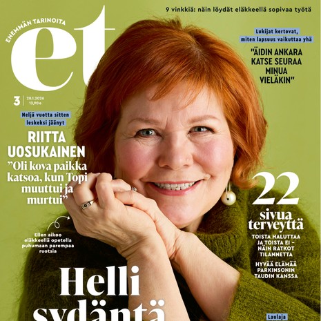 Ihmiset Ystävyyssuhteiden uuvuttama 80-vuotias: ”Tarvitsen ympärilleni ihmisiä, joista saan energiaa” Ihmiset Elämän koulima Arja Saijonmaa, 81: ”Ei voi jäädä itsesääliin löllöttämään” Ihmiset Pirjon hiihtolomamatka sai yllätyslopun: ”Bussipysäkillä odotti karvalakkipäinen mies” Et ikinä arvaa keneen törmäsin Kilpailut Mikä on ET-lehden 3/2026 paras juttu? Vastaa ja voita! Terveys Kysy terveydestä! ET-lehden omalääkäri Risto Laitila vastaa Kysy asiantuntijalta! Ihmiset Eero, 79: ”Kari Tapio kirjoitti vaimolleni kortin hotellin aulassa” Et ikinä arvaa keneen törmäsin Ihmiset Erikoislääkäri Aarne Koskimies, 80: ”Hedelmöitys on aina ihme” Terveys Koko ajan palelee ja huimaa – olenko parantumattomasti sairas? Ihmiset Suomen EU-jäsenyydestä neuvotellut Pertti Salolainen, 85: ”He tekivät palveluksen Suomelle” Sisältö jatkuu mainoksen alla Suosituimmat Koti Orkidea hurmaa Käsityöt Virkkaa iki-ihana ET-kesäkassi Terveys Näin hoidat nivelrikkoa oikein kotona Piha & puutarha Näin leikkaat orapihlaja-aidasta kauniin Käsityöt Ompele kaunis kesämekko Terveys Onko paastosta hyötyä vai haittaa? Kaksi asiantuntijaa vastaa Raha Kysy lakiasioista! ET-lehden perhejuristi Katariina Kuusiluoma vastaa Kysy asiantuntijalta! Terveys Kysy terveydestä! ET-lehden omalääkäri Risto Laitila vastaa Kysy asiantuntijalta! Lämmintä langoista Varpaat lämpimään: Tee kauniit konttineulesukat Tee itse somat perinnelapaset: 17 maakuntaa, 17 ohjetta Varaudu viimaa vastaan! Virkkaa hieno tupsupipo Neulo ihana jättineulospipo trendiväristä – ota ohje talteen Virkkaa ihana plussapeitto! Neulo ruutusukat Maikin malliin Hyödynnä vanha villatakki – ompele tyynynpäällinen neule- ja samettitilkuista Neulo kätevät ja kauniit läppälapaset Väriä olohuoneeseen! Virkkaa ihania afrikankukkia ja kokoa ne huovaksi Neulo kaunis pitsihuivi Muistatko Tankki täyteen -sarjan? Näin neulot helpon Sulo Vilén -pipon Neulo vauvalle ihanat piparkakkusukat Neulo talveksi kaunis kirjoneuletakki Neulo hehkuva palmikkoneulehuppu Virkkaa torkkupeitto ja neulo putkisukat Neulo pehmoinen villahuppari mummon kullalle Sisältö jatkuu mainoksen alla ET Terveys Laulaja Tarja Ylitalo, 74: ”Olen löytänyt elämisen ilon uudelleen” Toimittaja Hilla Blomberg, 66: ”Eläkkeelle jäätyäni ryhdyin toimistomummoksi” Suuta kuivaa! Löytyykö syyllinen lääkekaapista? Näyttelijä Seela Sella, 88: ”Sairauskohtauksen jälkeen tein heti sen virheen, jota ei pitäisi tehdä” Uinnin jälkeen kutittaa kamalasti - voisiko se olla järvisyyhyä? Näyttelijä Liisamaija Laaksonen, 87: ”Ryhdyin kirjoittamaan, koska minua otti niin päähän, että naisten roolit alkoivat loppua” Nivelpsoriasikseen sairastunut Eija, 61: ”Lääkkeen avulla pääsin elämään kiinni” Keikahtiko tyroksiiniarvo? Vaikka kilppari kiukuttelee, aina ei ole syytä huoleen Salliiko lääkäri iltahömpsyn? Voisiko se olla uniapneaa? Aivoverenvuoto 56-vuotiaana muutti Pekan elämän pysyvästi: ”Harrastuksesta tuli elämänlanka” Mikä neuvoksi, kun huulet ja sormenpäät halkeilevat kuivuuttaan? Kaari Utrio: ”Isossa talossani saatan tuntea yksinäisyyttä, luonnossa en koskaan” Tiesitkö? Tämä pieni koje torjuu tehokkaasti muistisairautta Mikä neuvoksi, kun nukkuja höpisee ja vaeltaa unissaan? Olivatko tekonivelet ennen kestävämpiä? ET:n omalääkäri vastaa Raha Kuolinpesästä on kavallettu omaisuutta – mitä voin tehdä? Terveys Virtsankarkailusta kärsivä nainen: ”Miksi lääkärit ovat eri mieltä hoidostani?” Ihmiset Uskon myötä raitistunut laulaja Kaj Hyttinen: ”Huomasin, että ristinmerkki auttoi” Terveys Levottomat jalat kiusaavat Else-Majta: ”Kuin muurahaiset kävelisivät hermoja pitkin” Rakastetuimmat tarinat 101-vuotias Elli asuu yksin: ”Viikonloput vietän miesystäväni luona” Parisuhdekouluttaja Marianna Stolbow: ”Lapsuus vaikuttaa siihen, keneen rakastumme” Väärän diagnoosin saanut Teija löysi ilon pyörätuolitanssista: ”Kun musiikki alkaa soida, unohdan kaiken muun” Poliisipastori Carita Pohjolan-Pirhonen: ”On menetyksiä, joista ei toivu koskaan” Maajussista moniosaajaksi Tosimiesten kylä Isän ja pojan maitotilalla lehmä saa tulla tupaan: ”Kun viiliästi ottaa niin pääsee helpommalla” Kari jätti ahdistavan uskonyhteisön: "Kävin elokuvissa ensimmäistä kertaa 52-vuotiaana" Riitta asuu lähes erakkona mökissään: ”Täällä pysyn paremmassa kunnossa kuin rivitalossa” Paula Koivuniemen, 70, mielestä paras elämä alkaa viisikymppisenä: "Enää ei tarvitse esittää mitään" Raija Auvinen menetti miehensä ja poikansa äkillisesti: "Tyttären kuolemaa en enää kestäisi" Arvo palasi rakkaaseen Antreaan: ”Sain synnyinkotini takaisin ilmaiseksi” Yksin omasta halustaan - tällaista on Annan eläkeaika saarella Televisiosta tuttu Jaakko Selin jätti vehnän pois: "Näin lähti äijämaha" Matti, 76, asuu kahdestaan Down-poikansa Pertin kanssa: "Onni on pienissä asioissa" Kaisa Liski selvisi vuosien parisuhdeväkivallasta: "Nyt minulla on oikea elämä" Käsityöt Tee itse somat perinnelapaset: 17 maakuntaa, 17 ohjetta Osallistu ja voita Mikä on ET-lehden 3/2026 paras juttu? Mikä on ET Terveys -lehden 1/2026 paras juttu? ET Terveysristikko 1/26 Pian Tapio Lehtinen, 64, viettää monta kuukautta yksin purjeveneessään Matkaoppaan kuvakisa: Lähetä kuva hotellihuoneen sängystä ja voita mariskooli! Matkaoppaan kuvakisa: Lähetä kuva aalloista ja voita Mariskooli! Matkaoppaan kuvakisa: Lähetä kuva erikoisesta hiekasta ja voita Mariskooli! Matkaoppaan kuvakisa: Lähetä kuva erikoisesta rakennuksesta ja voita Mariskooli! Matkaoppaan kuvakisa: Lähetä kuva maisemasta ja voita Mariskooli! Matkaoppaan kuvakisa: Lähetä kuva taivaasta ja voita Mariskooli! Matkaoppaan kuvakisa: Lähetä kuva lomasäästä ja voita Scent of Finland -tuoksu! Matkaoppaan kuvakisa: Lähetä kuva suomalaisesta rant
