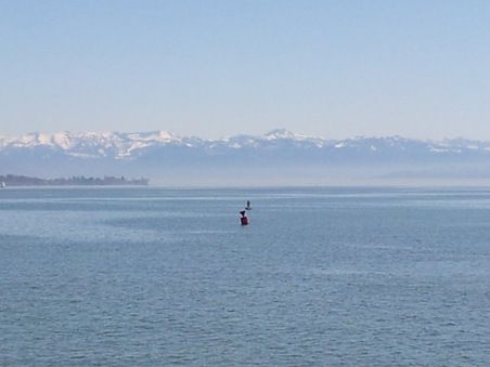 Tämäkin kuva on otettu Saksan puolelta Friedrichshafenista, jossa sijaitsee kuuluisa Zeppelin museo. Rannalla ja lautalla on mukava katsella veden toisella puolella kohoavia Sveitsin Alppeja.