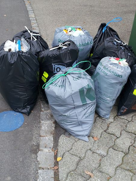 Sveitsissä loppujätteelle on aivan omat, harmaat tai mustat säkit. Keltainen merkki viestii, että olet maksanut jätemaksun. Sininen pompula kadulla näyttää paikan, johon säkin voi kadulla jättää tiettynä viikonpäivänä.