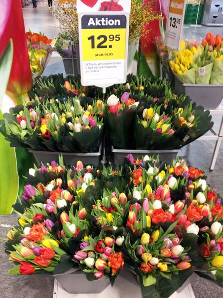 Kreuzlingenin co-op-supermarket lupaa, että 16 tulppaanin kimppu säilyy heleänä viisi päivää. (10 frangia on noin 8 euroa.)