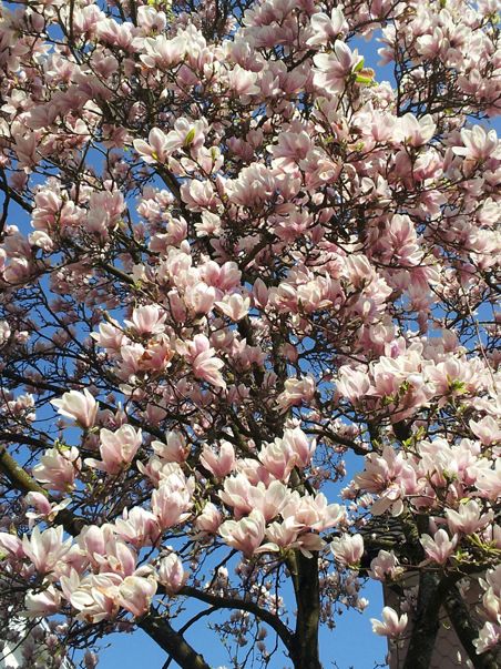 Vaaleanpunaiset ja keltaiset pensaat ovat kotini vieressä. Magnolia ja japaninkirsikkapuu kukkivat ystäväni talon pihassa.