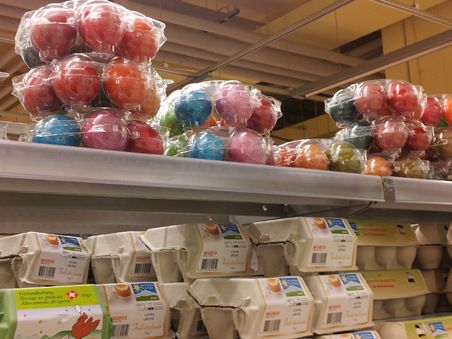 Kiireisen pelastus? Supermarkeista voi ostaa ympäri vuoden keitettyjä, valmiiksi maalattuja munia. Niitä käytetään esimerkiksi retkieväinä ja salaateissa, sillä näiden munien keltuaisten ympärykset eivät tummu, vaan ne säilyttävät raikkaan värinsä. Siellä ne ovat hyllyssä muiden munien joukossa, ja keitetyiksi ne tunnistaa juuri värin vuoksi.