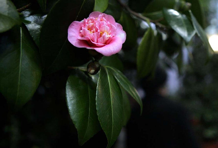 Helsingin Talvipuutarhan ylpeys, reilusti yli satavuotias Japanin kamelia on juuri aloittanut uuden kukinnan.