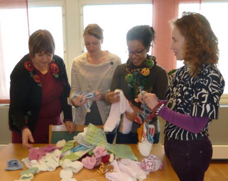 Toinen toistaan upeammat neuleet herättivät ansaittuja ihastuksen huudahduksia. Töitä ihailevat vasemmalta ET:n päätoimittaja Riitta Korhonen, vauvaperhe turvapaikanhakija -projektin projektityöntekijät Tiuku Pennola ja Wiam Elfadl sekä projektipäällikkö Anna Mikkonen.