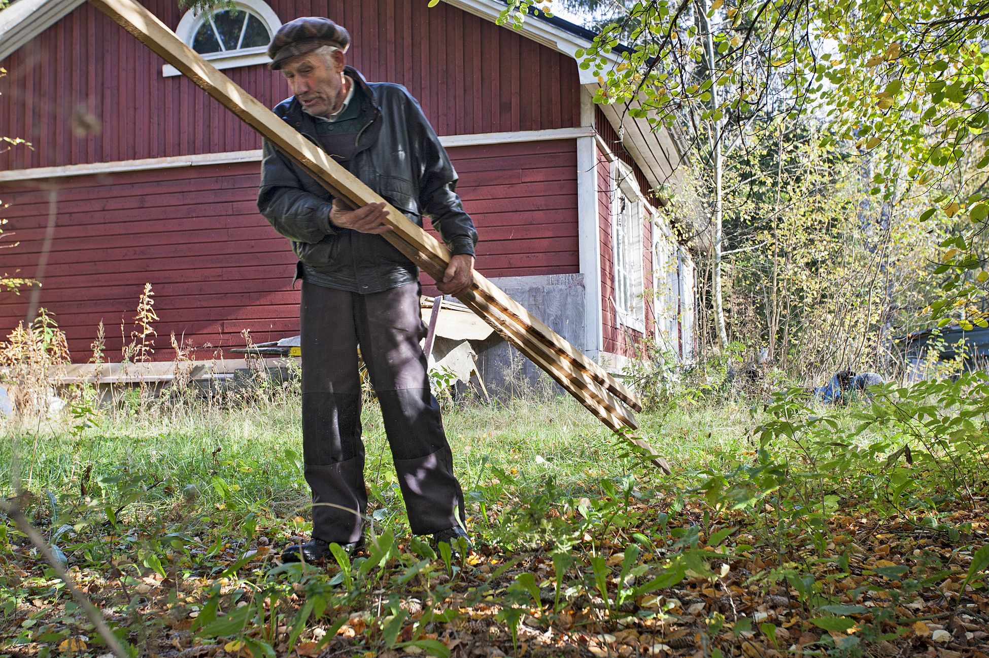 Rauni Uotila, 88, valikoi sopivaa puutavaraa saunan sisätöihin. Rakennustarvikevarasto on yksi hiirenhiljaisen tontin rakennuksista Sontulan rauhallisen kylätien laidassa Akaan kupeessa.