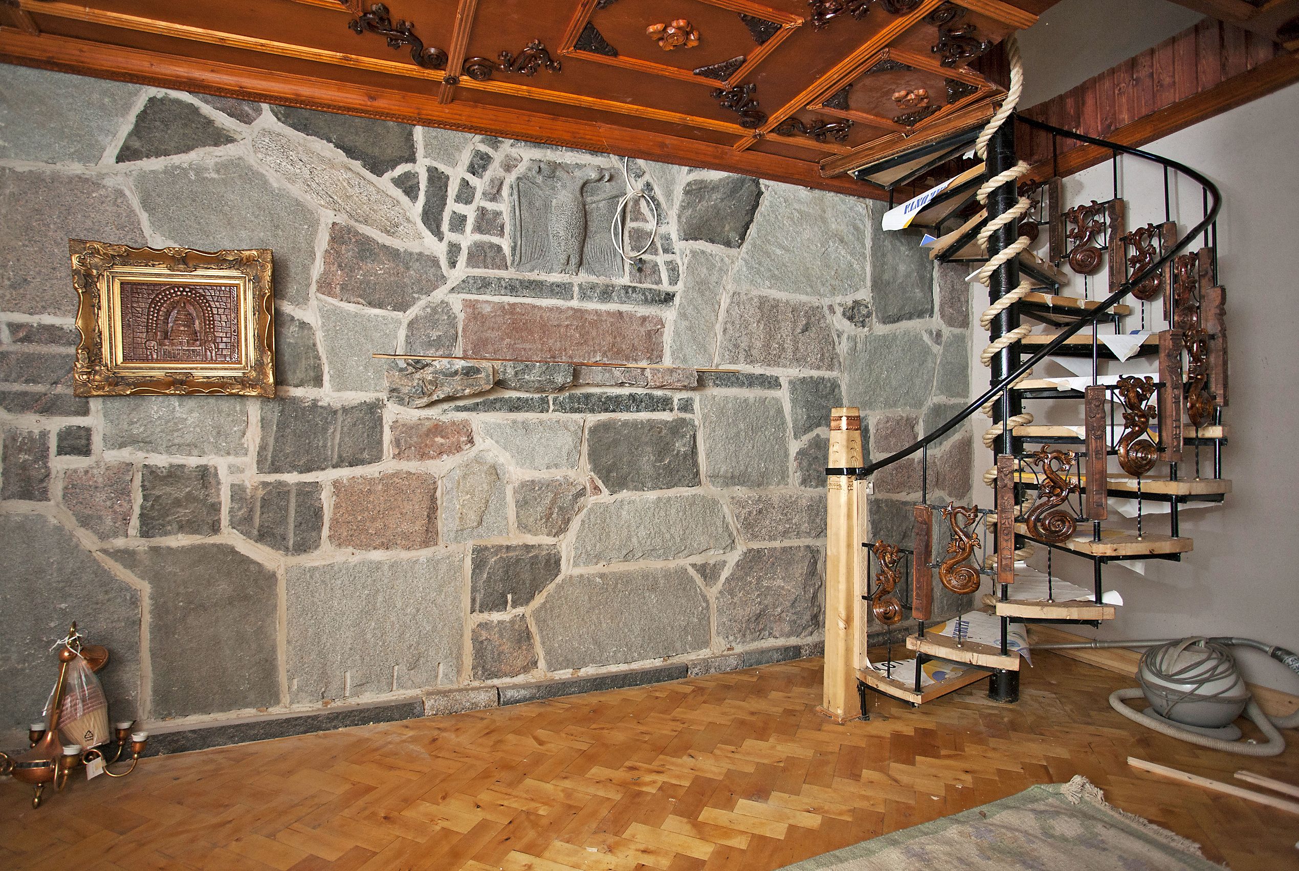 Olohuoneen seinästä isäntää tarkkailee kivestä veistetty kotka. Portaikon mies on takonut itse, kaiteet ja puuveistokset työstänyt omin käsin.