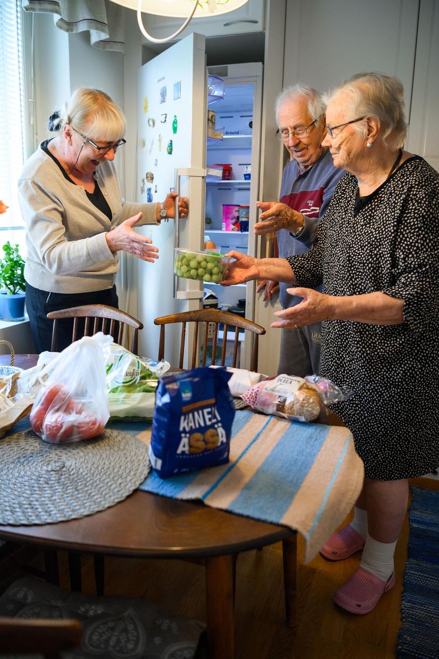 Merja, 66, on käynyt aamulla miehensä Karin kanssa ruokaostoksilla, ja latoo nyt ostoksia vanhempiensa keittiönpöydälle. Aili, 88, ja Aaro, 93, laittavat ostokset omille tutuille paikoilleen.