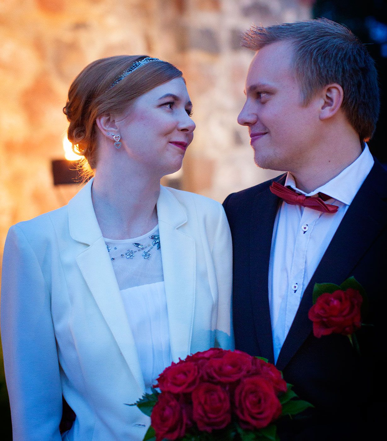 "Tapasimme toisemme työpaikalla, ja olemme asuneet yhdessä kymmenen vuotta. Avioliitto oli pitkäaikainen toiveemme. Häät vain ovat nykypäivänä joko elämää suurempi spektaakkeli tai koruton hetki maistraatissa. Hääyö tuntui meille sopivimmalta tavalta virallistaa suhteemme.
