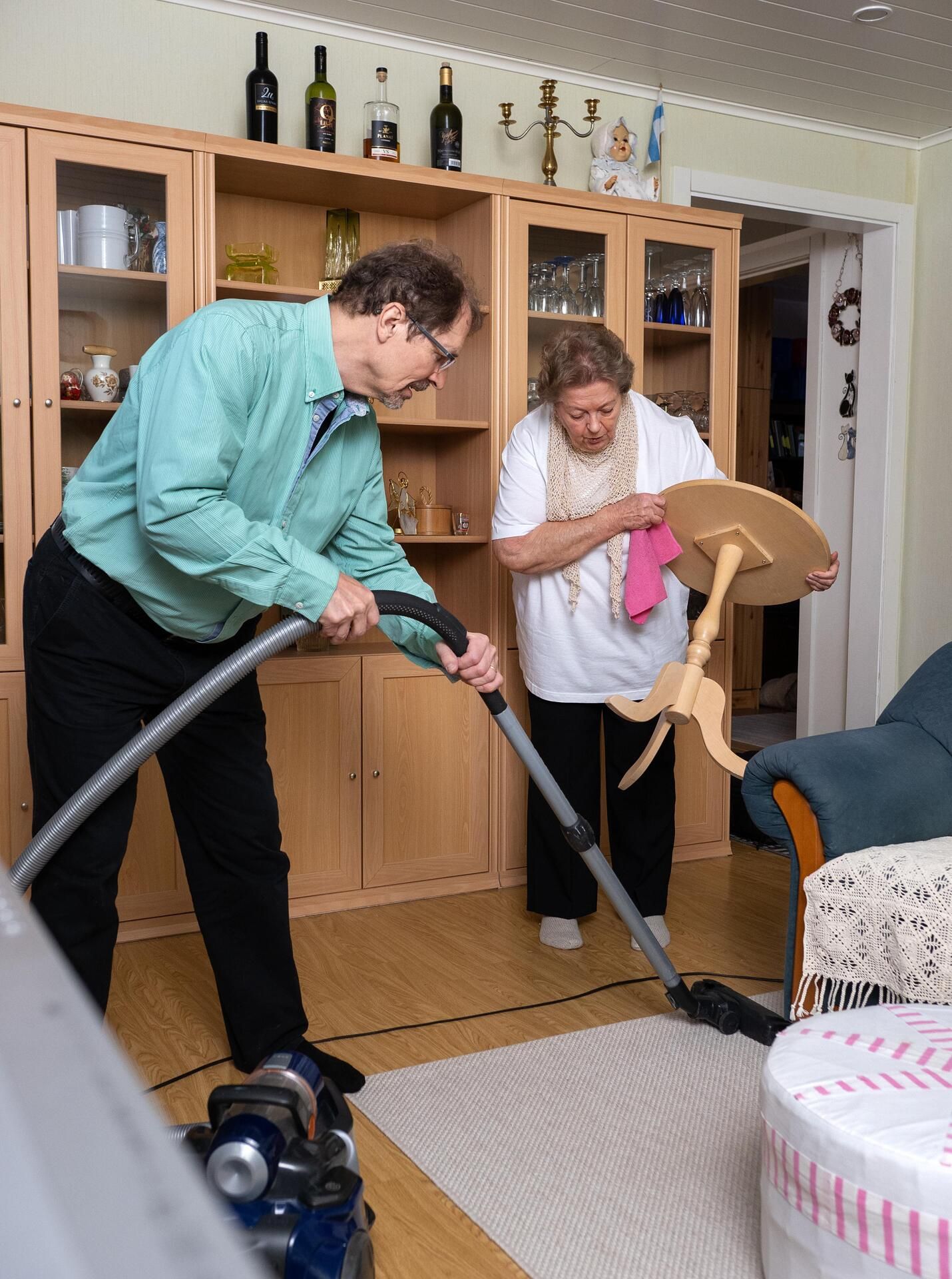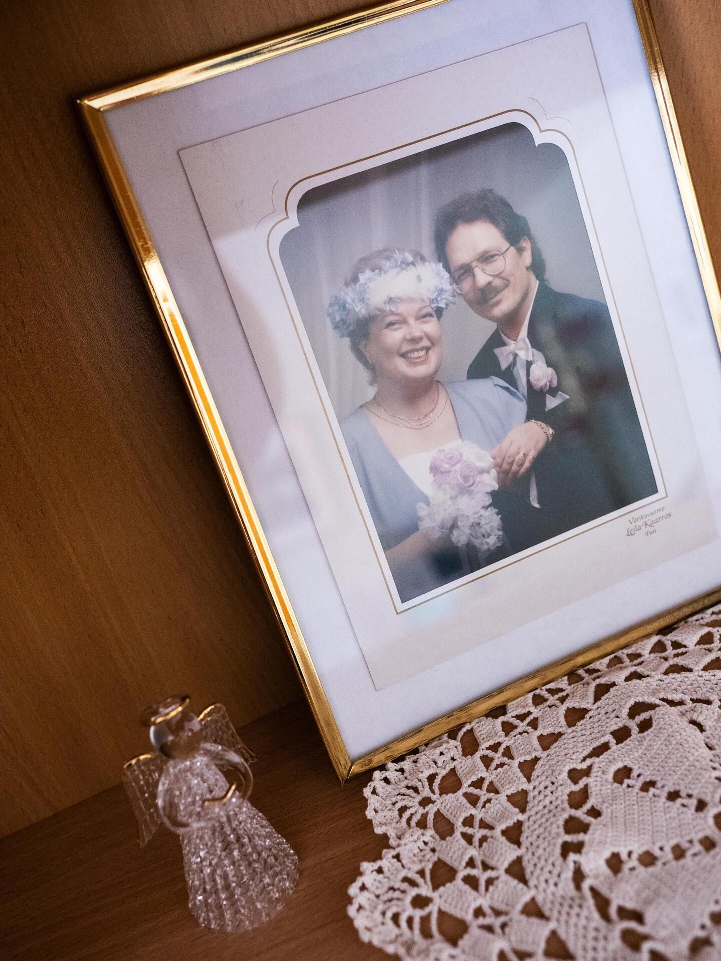 – Osaat neuloa, askartelet enkeleitä ja hienoja kortteja, ompelet vaatteita ja virkkaat pitsiliinoja. Laatoitit jopa pesuhuoneen. Minä olen kyllä hyvissä hoteissa. Leikkaat hiukseni ja lisäksi olet tosi hyvä kokki.