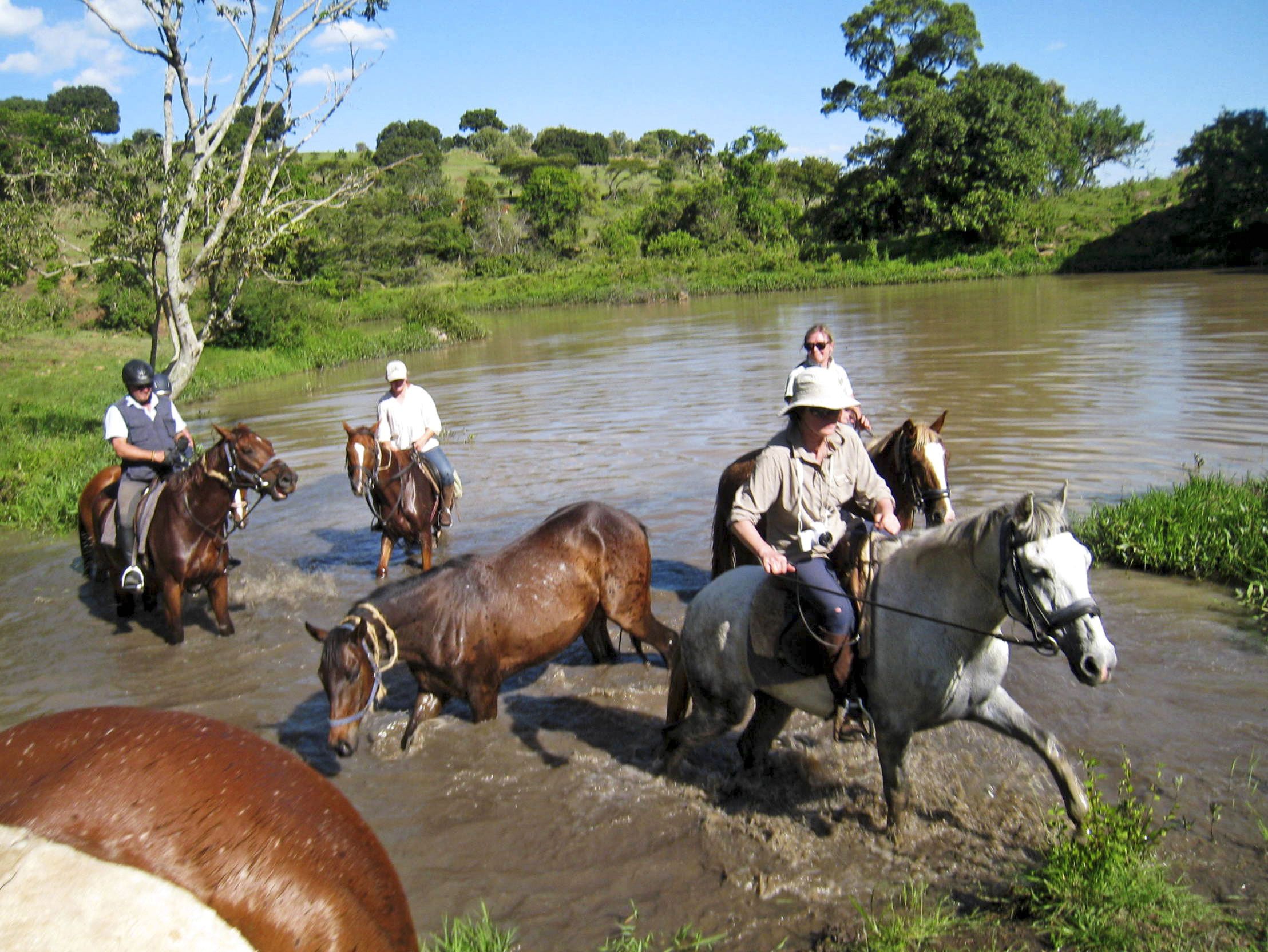 Tristanin perässä laskeudumme kuitenkin kuuliaisesti tiiviinä laumana jokeen. Hevoset ovat yllättävän säyseitä. Vesi ulottuu vain niiden vatsan korkeudelle. Virtahevot pysyvät meistä parinkymmenen metrin päässä.