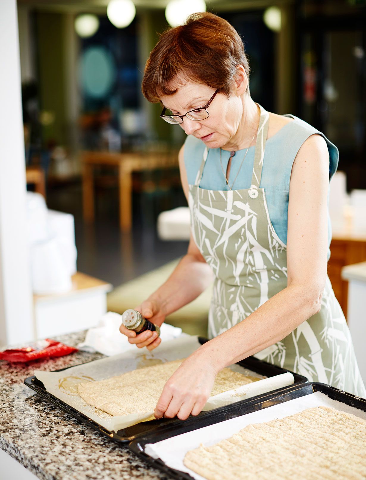 Teen joka päivä erilaisen kasviskeiton ja sille tuoreen leivän. Minulla on 25 eri vaihtoehtoa, joita vaihtelen porkkanaleipäsistä rosmariini-parmesaanitikkuihin. Ehkä joskus tarjoan keiton koverretusta sämpylästä. Tuoreet vohvelit ovat tärkeä osa ruokalistaani. Täytteeksi saa niin suolaisia kuin makeita herkkuja. Haluan kaiken olevan hyvää ja aitoa, ja siksi keitän hillotkin itse. Marjat poimin kesällä Ristiinasta. Porkkana- ja punajuurikakku sekä lantturieskat ovat suosikkejani. Mehevyys tulee niihin raastetuista juureksista.