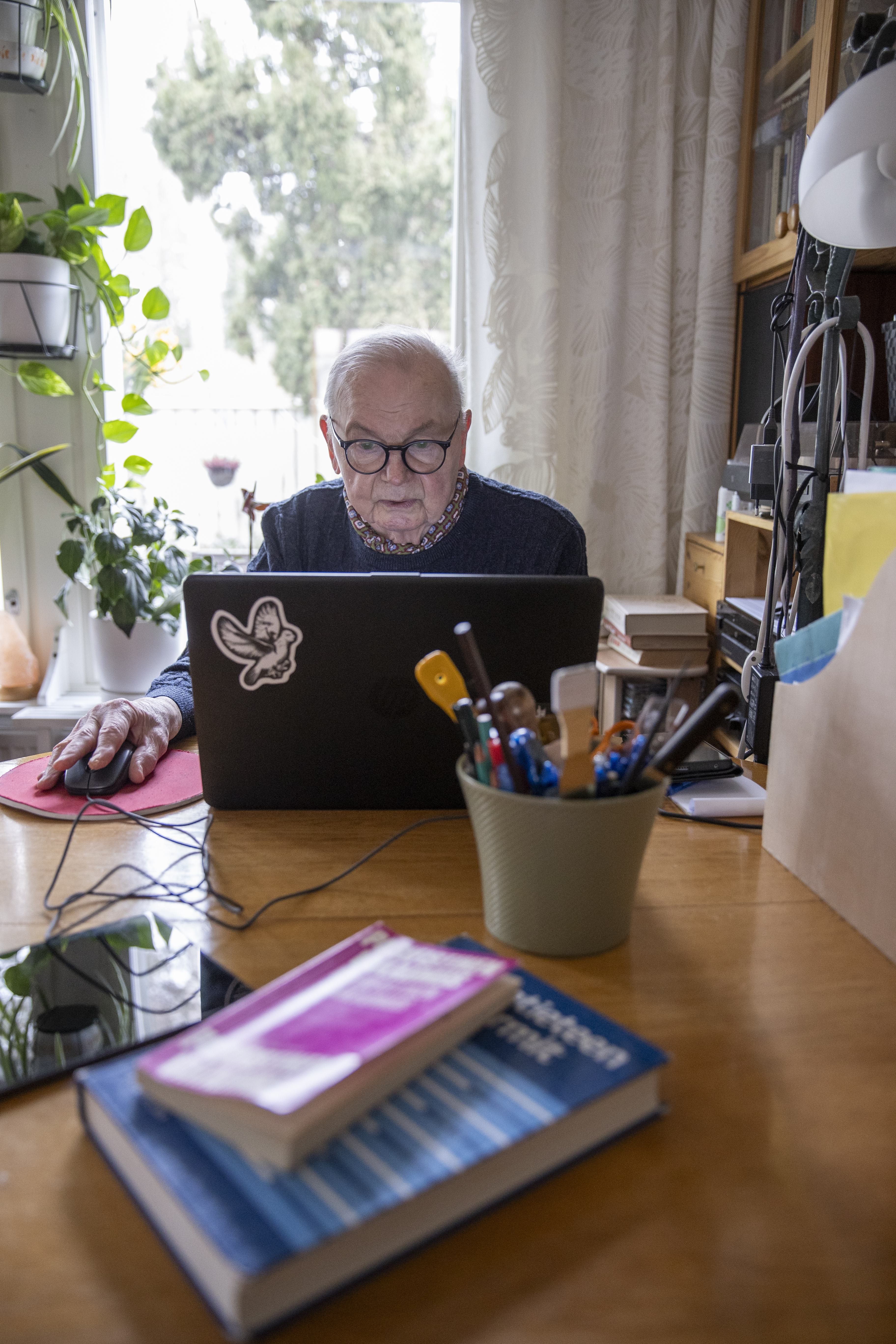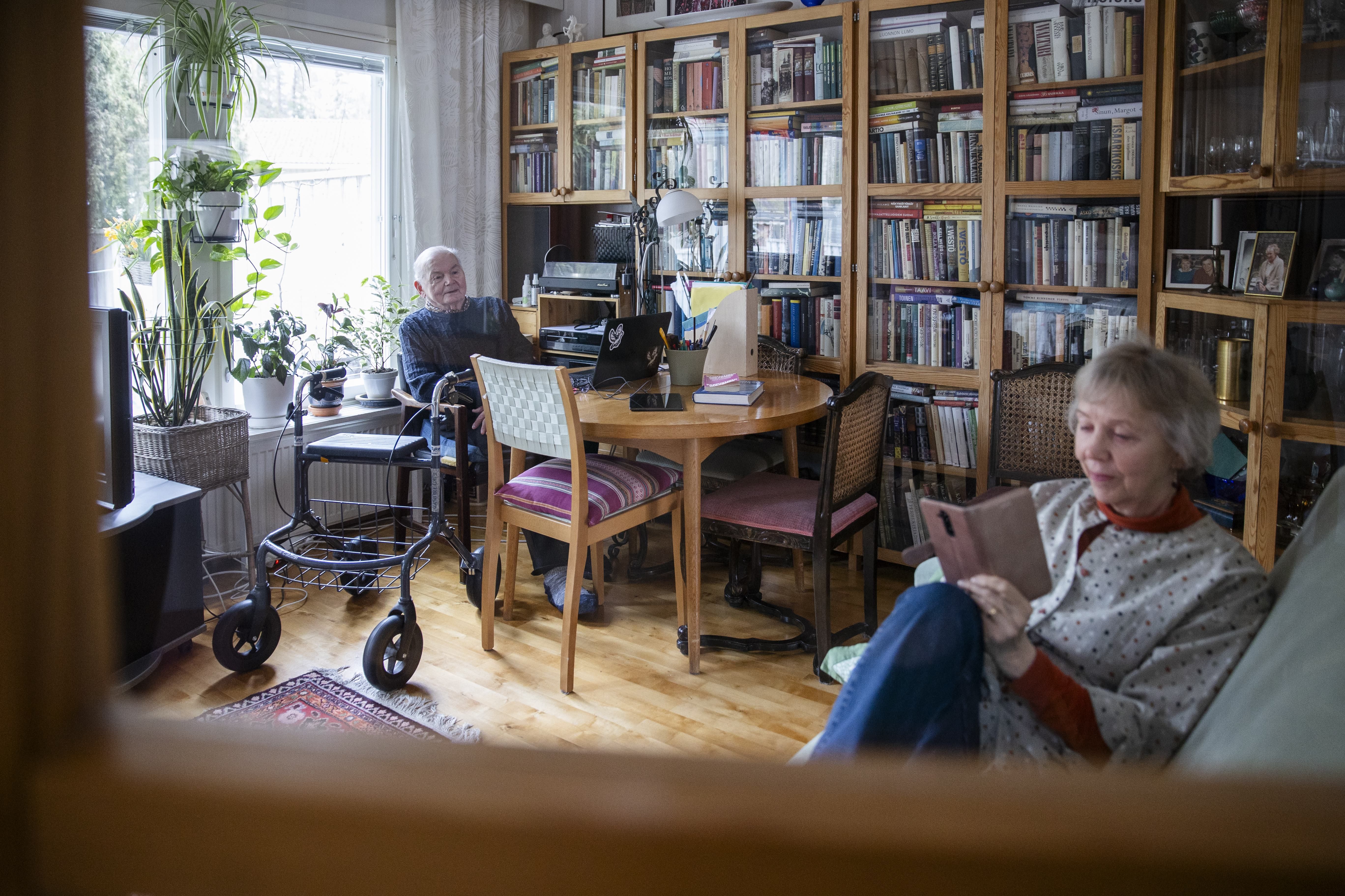 – Minun tietokoneeni oli yläkerrassa. Ja olisin minä pudonnut, vaikka sinä olisit ollut kotona, Esko sanoo ja vetää rollaattorin lähemmäksi työtasoaan, olohuoneen pyöreää pöytää.