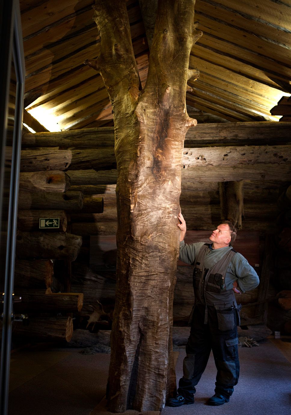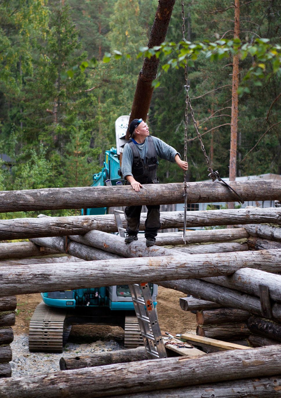 Hirsirakentaja, joka rakentaa uppopuusta ja tuhansia vuosia vanhasta hakopuusta.