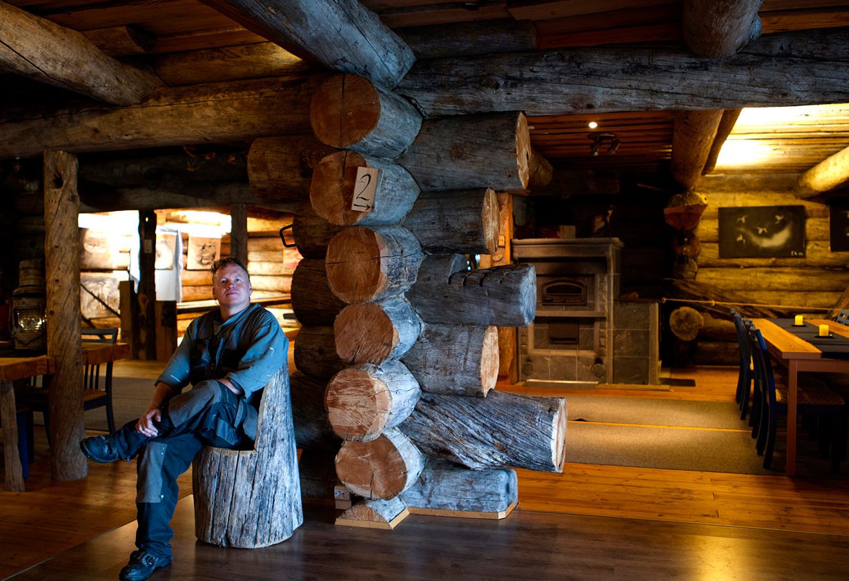Esa Heiskanen, 55, on omin käsin rakentanut Porosalmen laelle ja rinteille kylän upoksissa maanneista uppotukeista. Esa veikkaa, ettei missään ole rakennettu uppopuusta vastaavaa.