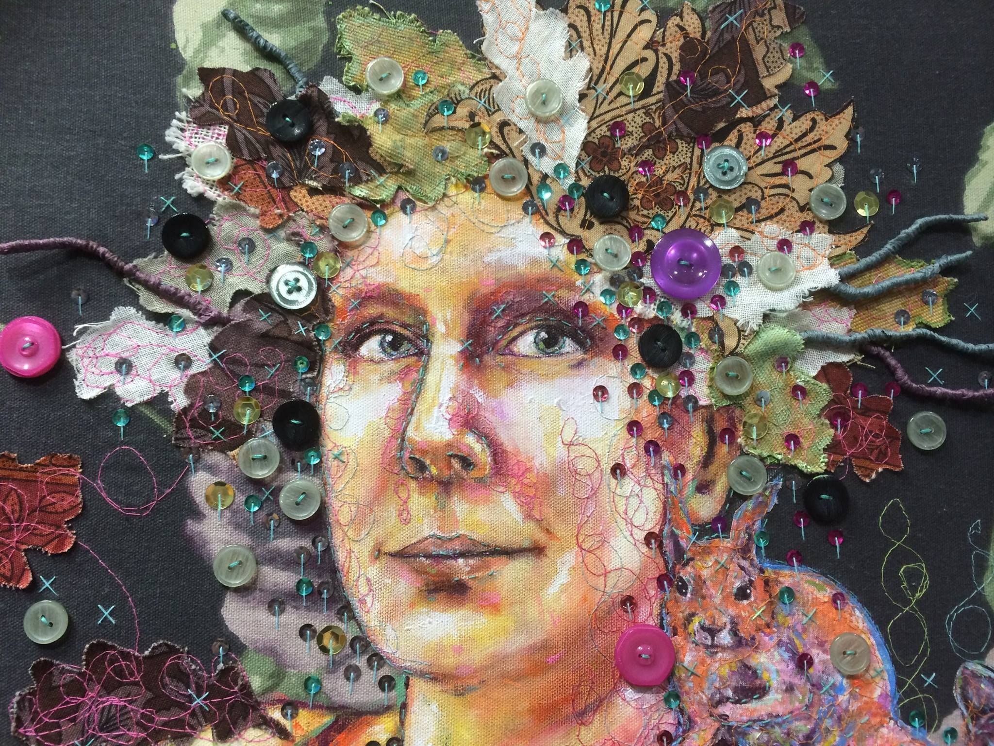 Teoksissaan hän muokkaa kankaanpainovärein maalaamaansa teosta erilaisin tekniikoin: lisää applikointia, kirjoo käsin ja koneella, ompelee pintaan nappeja ja paljetteja. Maalauksista tulee todella kerroksellisia, ja varsinkin käsityöntekijät katsovat niitä mielellään ihan läheltäkin, tekniikkaa ihaillen.