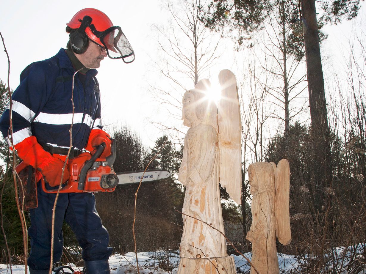 – Yhden enkelin sahaukseen kuluu monta päivä, sillä sahan käsittely on raskasta ja väsyneenä vaarallista. Ensin suunnittelen siipien koon. Teen kasvotkin moottorisahalla, mutta nenän ympärille jätän paljon puuta, ja työstän sitä hienostuneimmilla välineillä, Hannu kertoo.