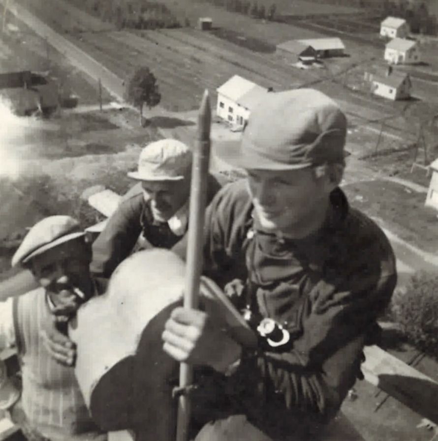 Minä, isä ja Rauno-veljeni teimme yhdessä kaikenlaisia rakennustöitä. Jos korkealla työskentely olisi huimannut, ei näitä hommia olisi voinut tehdä. Kirkon korkeus on 33 metriä. Minä kiipeän kuvassa ukkosenjohdattimesta kiinni pitäen. Kirkon 14 metriä korkea risti purettiin, sillä se oli aivan laho. Uusi tehtiin mäntypuusta.