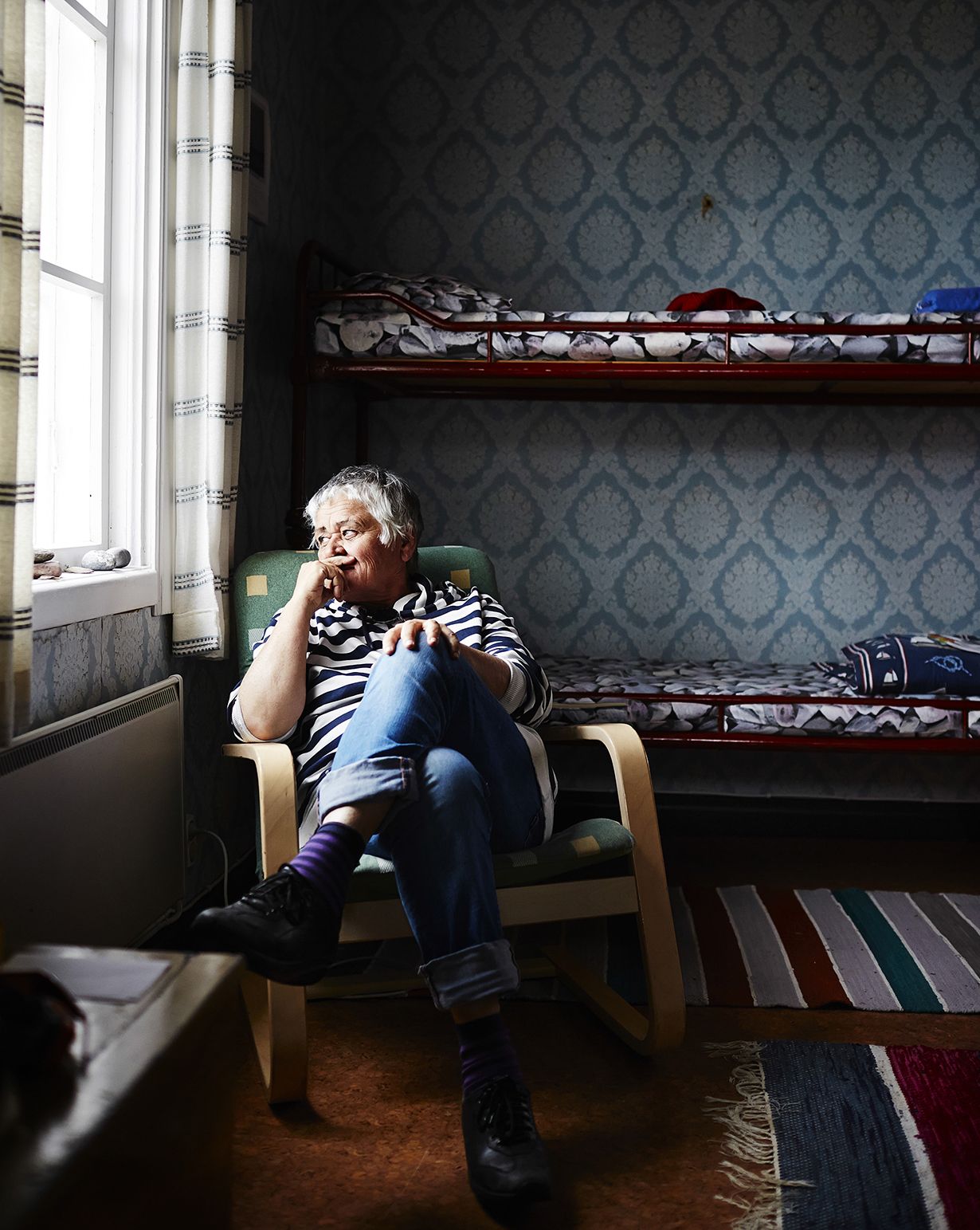 Luotsimökin tuvan pöydällä on kasa kirjoja, päällimmäisenä Muumipappa ja meri, mutta puhuri ja aallot tekivät mielen niin rauhattomaksi, ettei kirjoihin tullut tartuttua. Saisio istuu ikkunan vierellä, meri näkyy siitä hyvin.