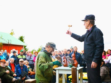Huutokauppaa seuraa taka-alalla Köyliön kirkkoherra Sakari Vuola. Hänen kasvoillaan on yhä hiukan häkeltynyt hymy, niin kuin tapahtunutta ei oikein uskoisi todeksi.
