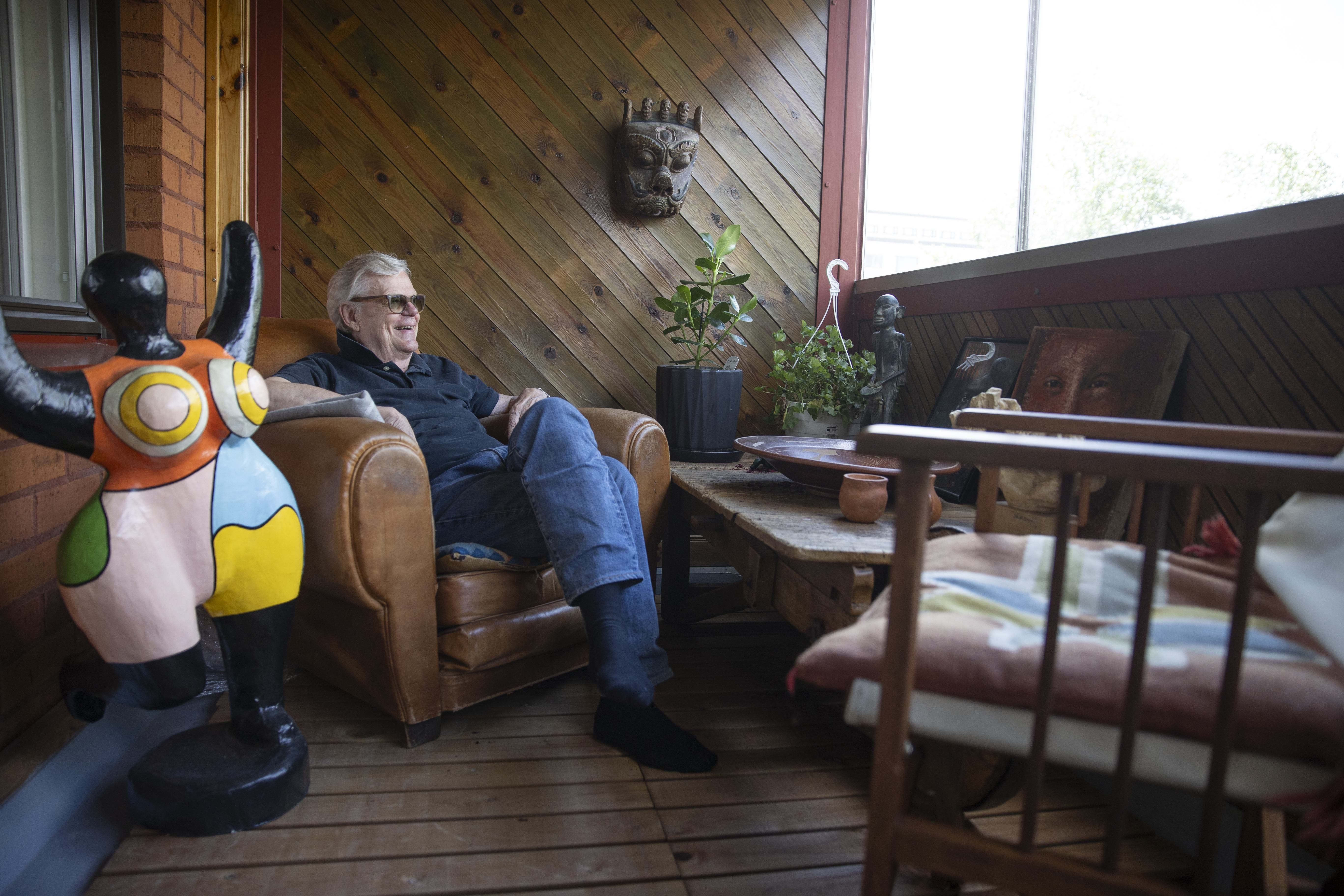 – En omista enää juuri mitään. Se on ihanaa. Minulla on nyt vapaus, Alpo sanoo hymyillen ja nojautuu syvemmälle jyhkeän punostuolin selkänojaa vasten.