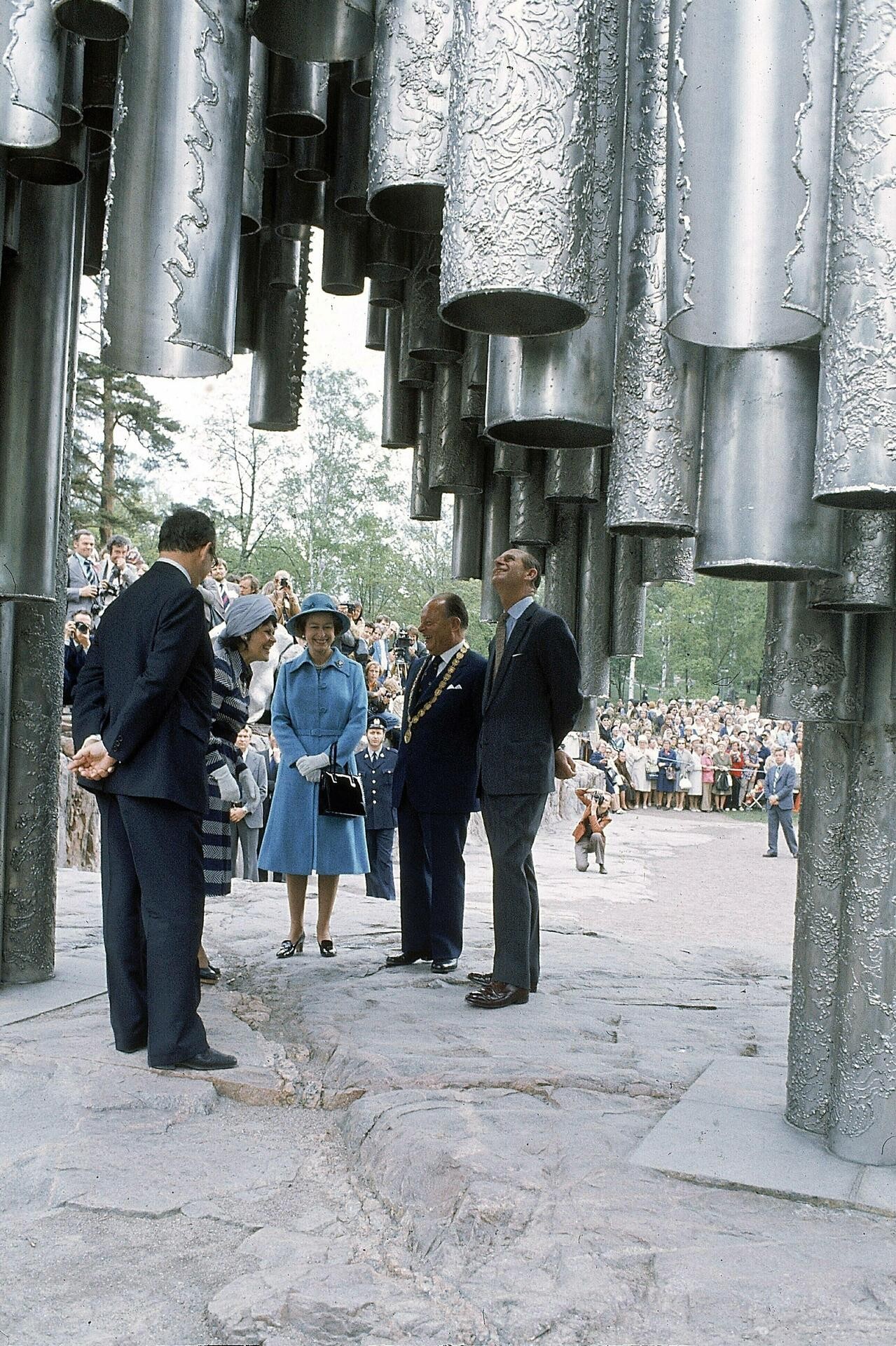 Kuningatar vieraili Sibelius-monumentilla vuonna 1976.