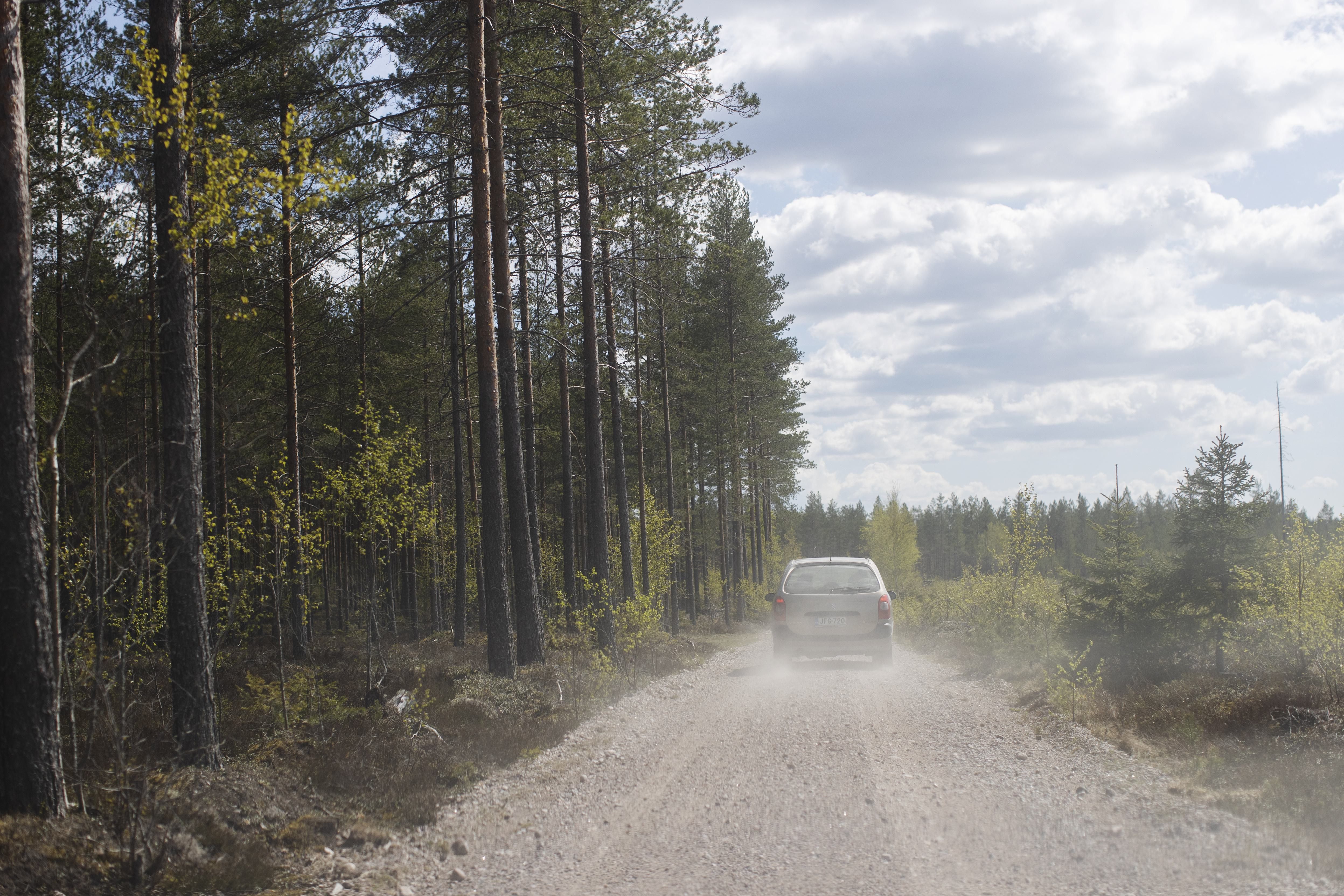 Edessä avautuu mutkainen hiekkatie. Allan painaa kaasua.