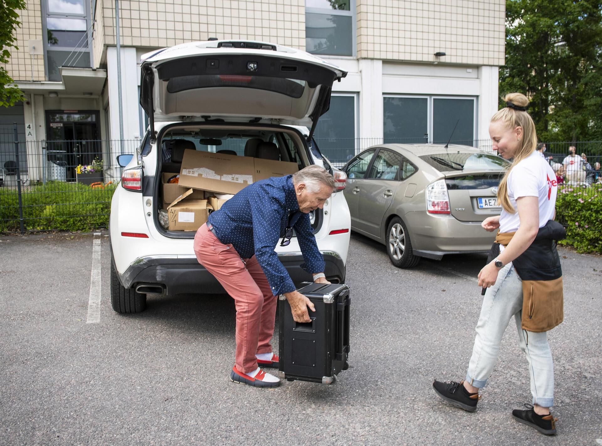 Eino peruuttelee hyväntuulisesti, kunnes auto on jotakuinkin ruudussa. Takakontista hän nappaa painavan näköisen laatikon, jota kantaa kevyesti.