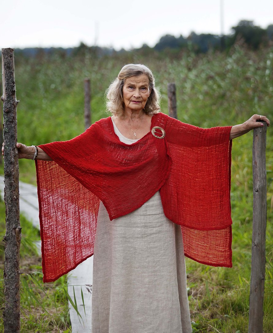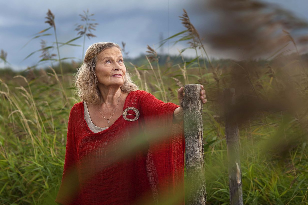 Kaislikko heilahtaa pitkospuiden vieressä, kun Anna-Liisa asettuu kuvattavaksi. Hän todella näyttää Lemminkäisen äidiltä.