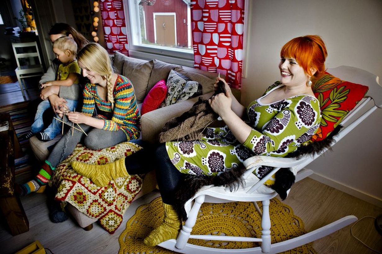 Olohuoneessa langat pursuilevat vanhasta tiinusta ja lasipurkit ovat pullollaan jämänöttösiä. Puikot majailevat papan puisessa ruuvilaatikossa. Sohvaa koristaa isoäidin neliöistä virkattu peite. Vanhat matkalaukut ovat täynnä lankoja.