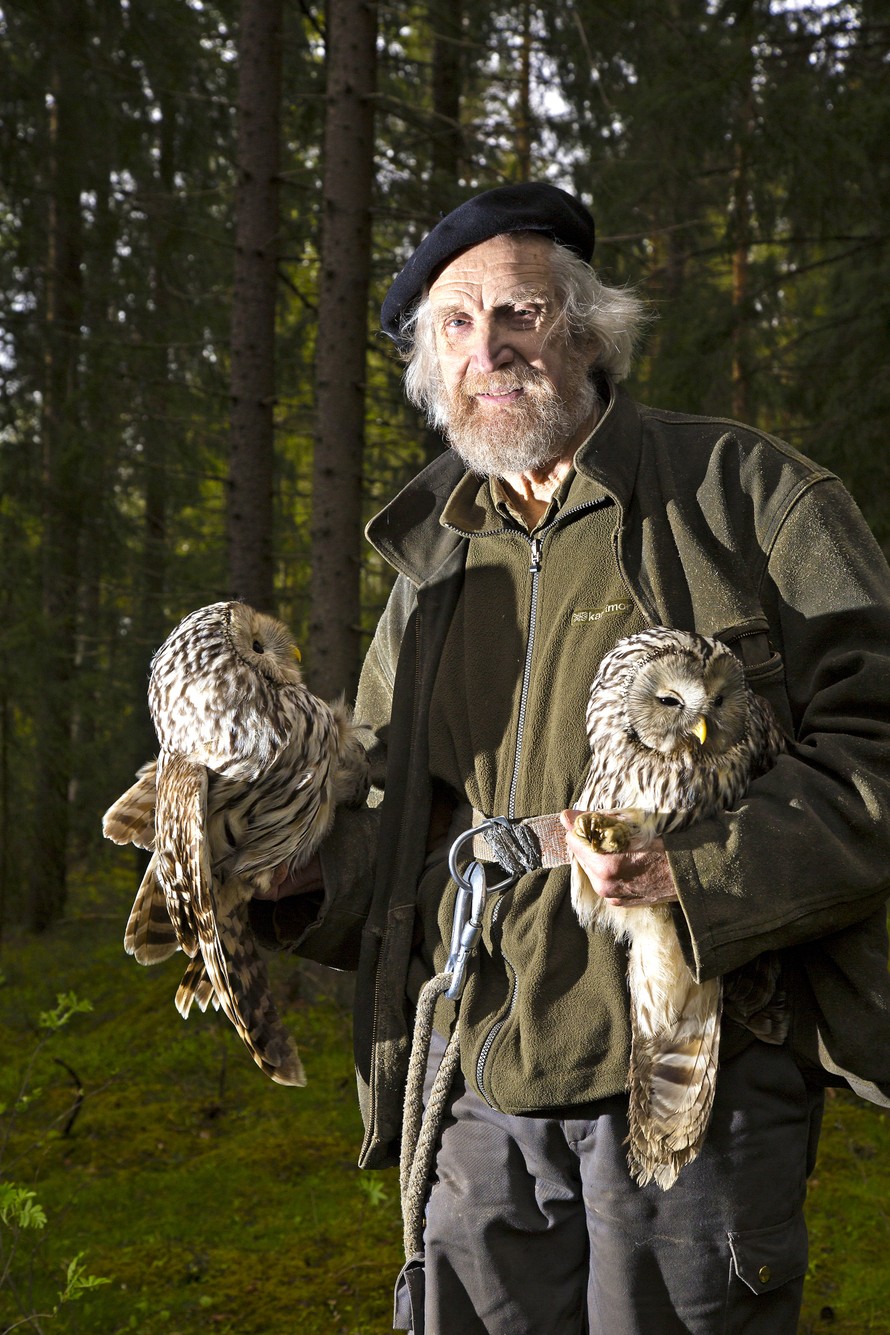 Juuri nyt mies pitelee hellästi säihkyväsilmäistä naarasta numero D-231325. Se on vanha tuttu, kymmenen vuotta sitten untuvikkona rengastettu. Saatuaan kangashupun nättiin päähänsä pöllö suhtautuu Saurolan mittauksiin tyynesti – tuttu mies, varmat otteet. Jälkeenpäin se lehahtaa läheiseen puuhun ja jää napsuttamaan uhittelevasti nokkaansa. Tulee mieleen intiaanien toteemit.