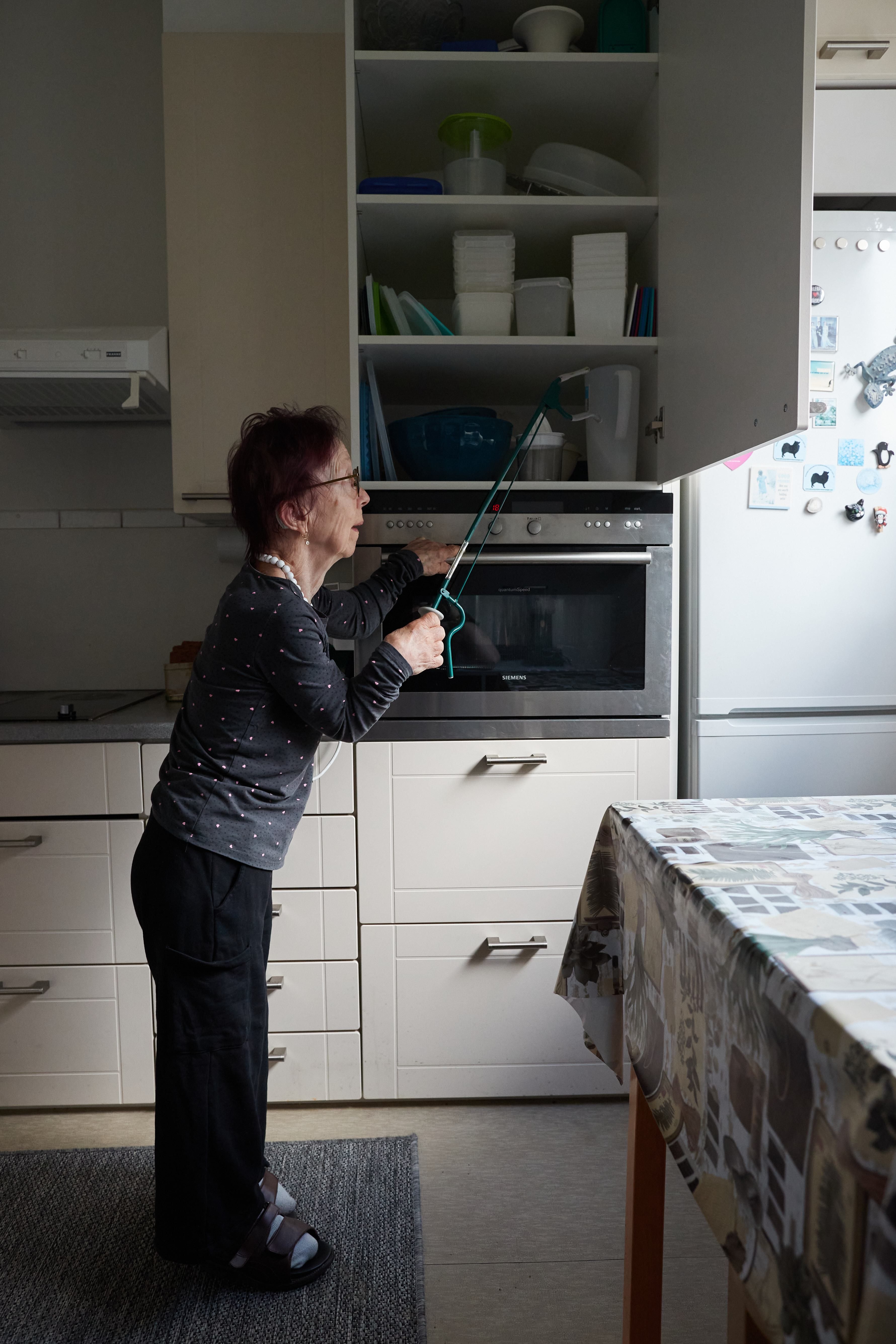 Käytän rollaattoria sisälläkin, sillä en pysty kävelemään ilman tukea. Ulkona minulle tuottavat ongelmia muun muassa portaat, pankkiautomaatit ja kauppojen automaattikassat.
