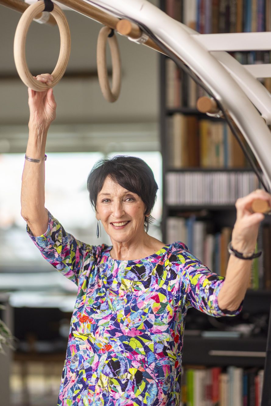 Puolapuilla ja niihin kiinnitetyn treenikuminauhan avulla venyttelen ja harjoittelen voimaa. Renkaissa roikkuminen rentouttaa.