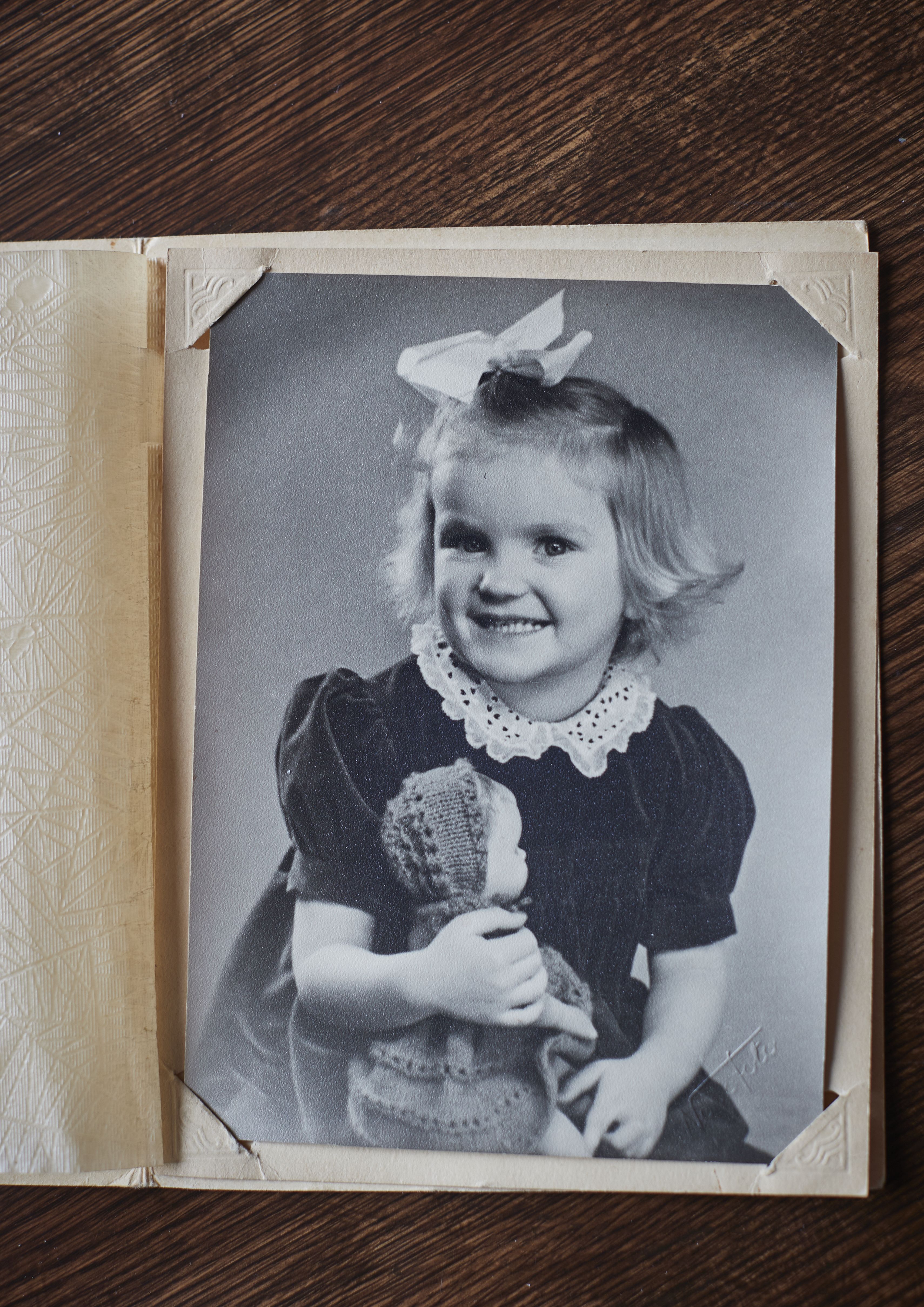 Sue käy hakemassa kirjahyllystä valokuva-albumin ja selaa esiin kuvan. Viisivuotiaan Suen hiuksissa on valkoinen rusetti ja yllä lempimekko, jonka pitsikaulus on Suesta ihana.