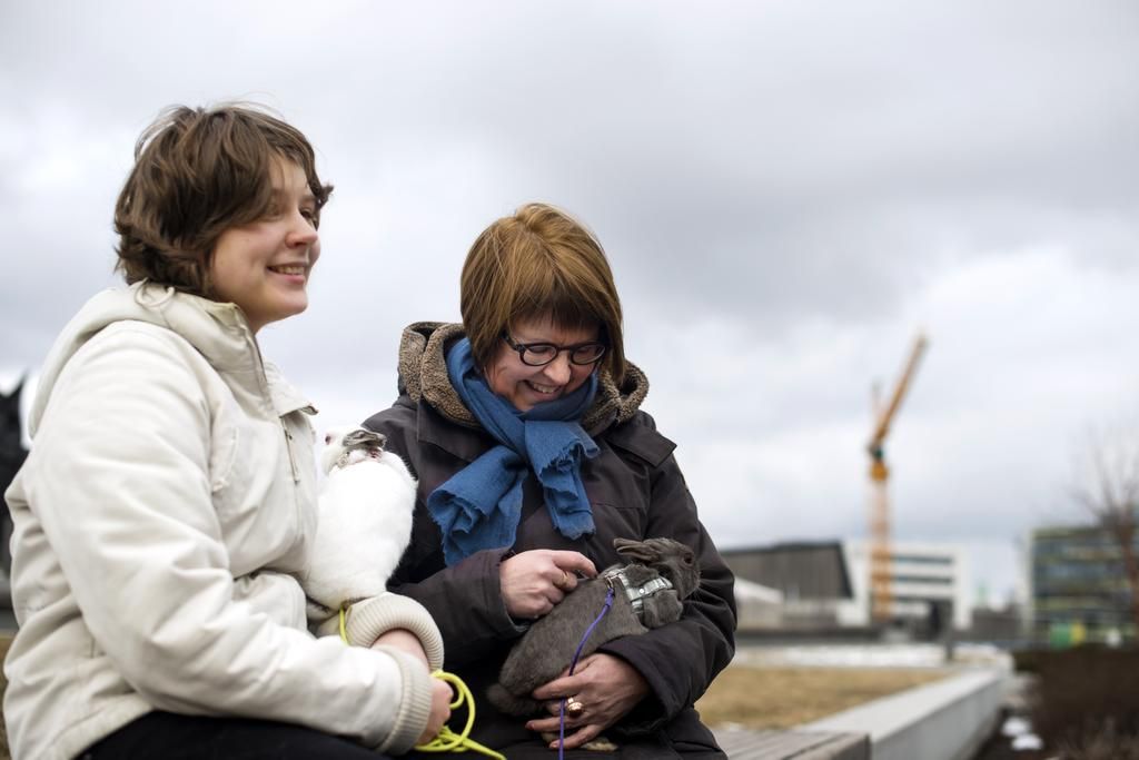 Helsingin Musiikkitalon pihamaalla loikkii kaksi pientä kania. Kääpiöjänikset Virna ja Fio ovat Anastasian kasvattamia pelottomia kanihyppääjiä.