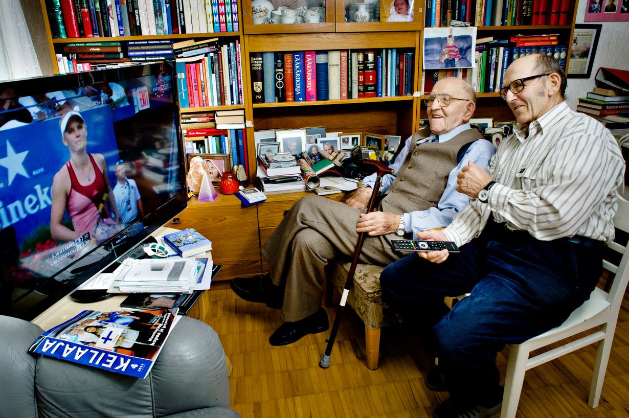 Väinö Rainosalo ja Pentti Rainosalo istuvat television äärellä kokkolalaisen omakotitalon olohuoneessa. Nyt katsotaan urheilua, mutta usein Pentti lukee isälleen ääneen paikallislehteä.