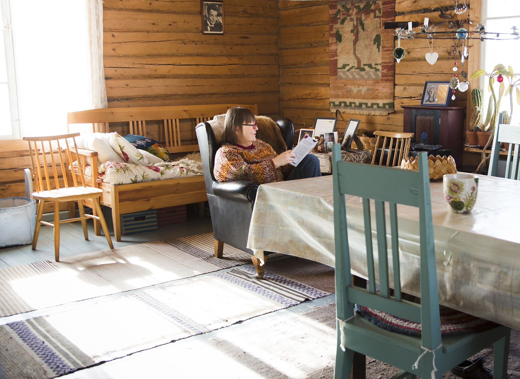 – Kuivurini on kylätalolla, samoin pakastimeni ja pesukoneeni, ja niitä voivat muutkin käyttää. Sieltä tuon myös juomaveteni ja siellä käyn suihkussa, kun puro talvella jäätyy pohjaan, hän kertoo.