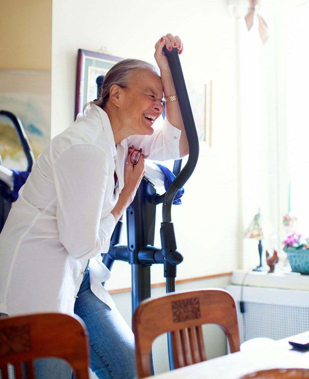 – Jos ei voi fyysisesti hyvin, ei voi hyvin henkisestikään, ja päinvastoin. Keittiömme nurkassa on crosstraineri, jota käytän aina kotona ollessani. Tänäänkin heräsin aamukuudelta treenaamaan. Katson samalla televisiosta uutisia ja muuta aamuohjelmaa.