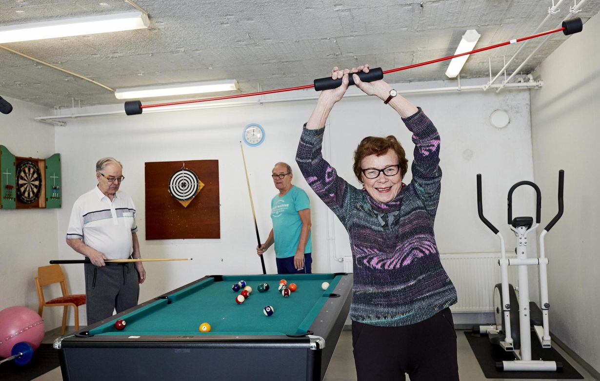 Vantaalla sijaitsevan senioritalon kellarissa on koolla kuntosalin vakiojengi. Vielä seitsemän vuotta sitten kellarihuone oli täynnä sekalaista tavaraa. Porukalla ne raivattiin pois ja tilalle hankittiin kuntosalilaitteita, pari kuntopyörää ja hulavanteita. Talossa vierailevia lastenlapsia viihdyttävät lautapelit ja iso biljardipöytä, jonka ääreen tosin kokoontuvat mielellään vanhemmatkin pelaajat.