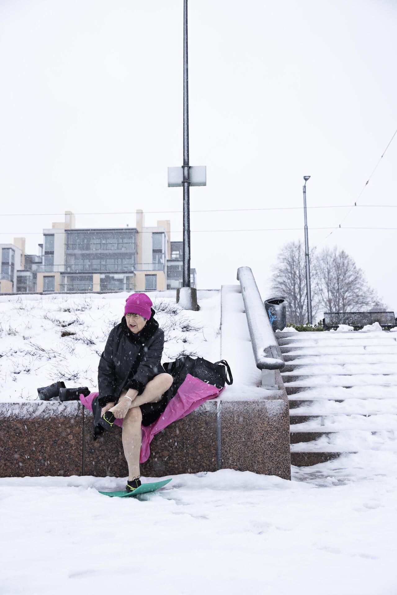 Eiranrannassa Helsingin eteläkärjessä tuulee kipakasti. Lemmikki riisuu toppatakkinsa, vetää neopreenitossut jalkoihinsa ja aniliininpunaisen pipon syvemmälle päähänsä. Sitten hän astelee mereen.
