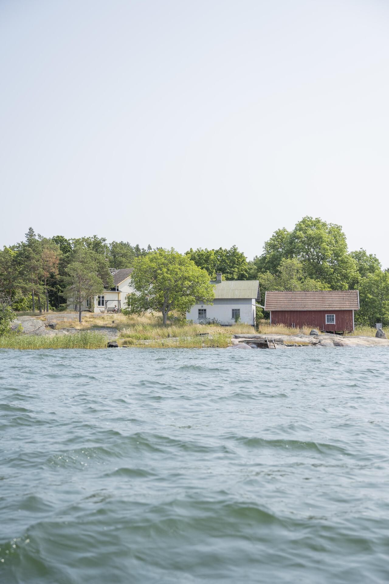 Merelle näkyivät kallioinen ranta, valkoiseksi kalkittu saunarakennus, punainen verkkohuone ja keltainen, ryhdikäs pieni talo.
