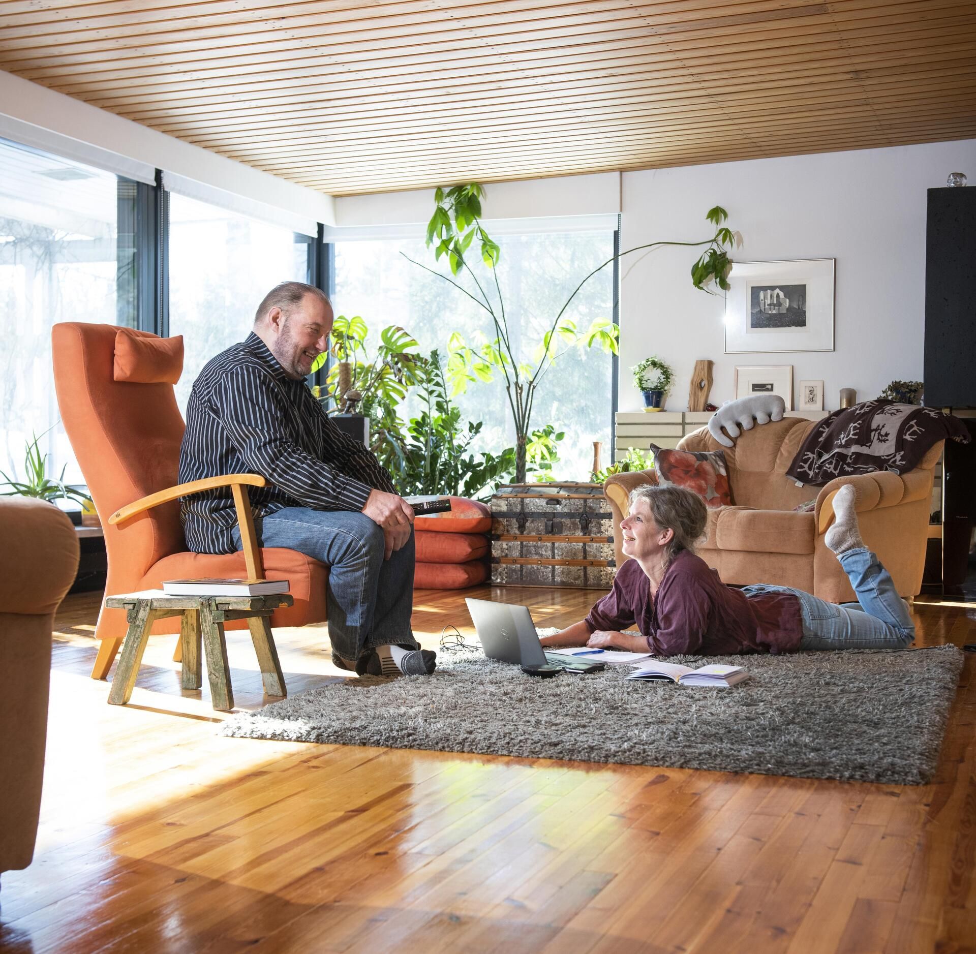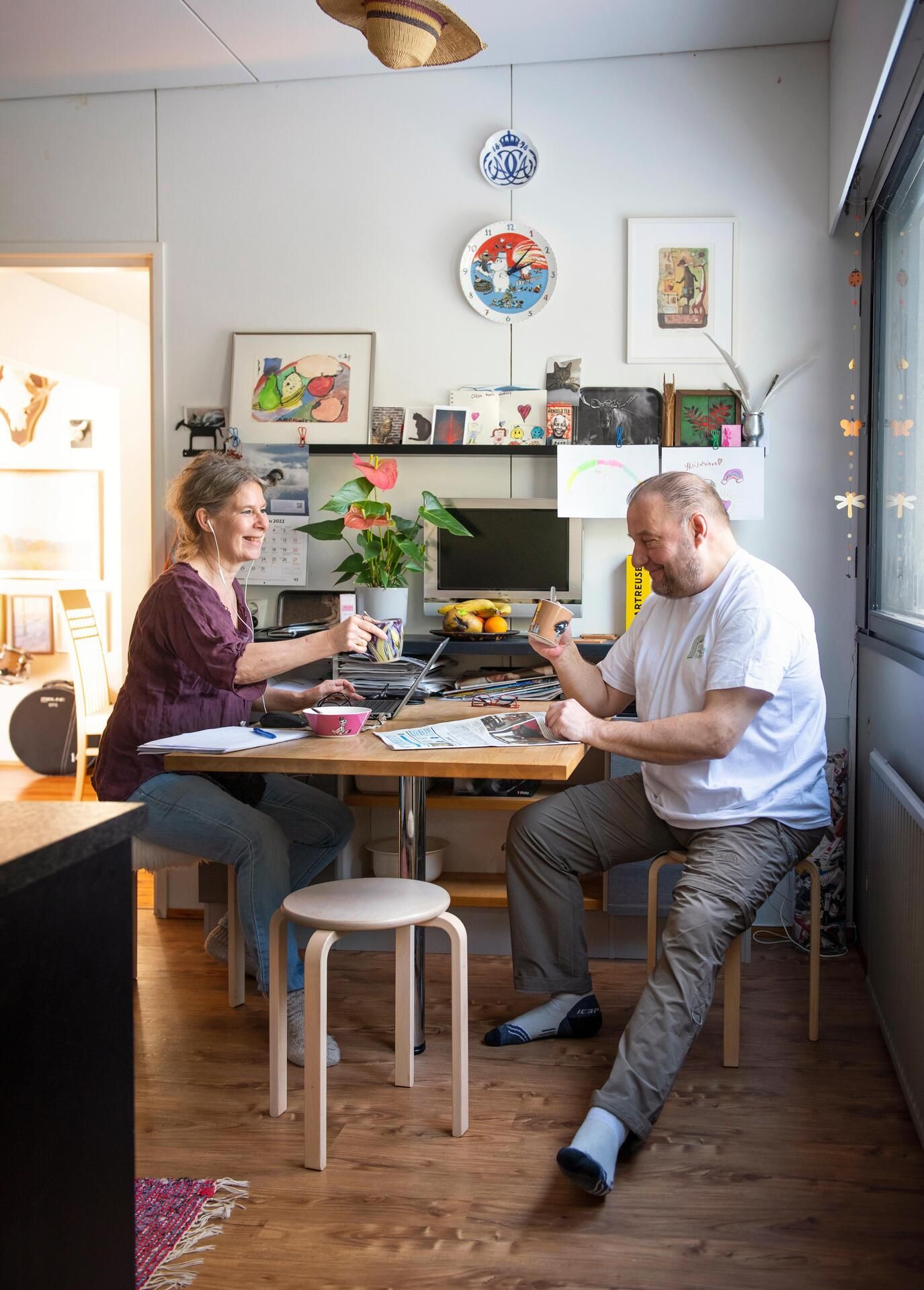 Talossa on yli kaksisataa neliötä ja tilava työhuone kummallekin, mutta tämän ahtaan pöydän ääressä he aloittavat aamunsa kuin ensiasuntonsa hankkinut nuoripari.