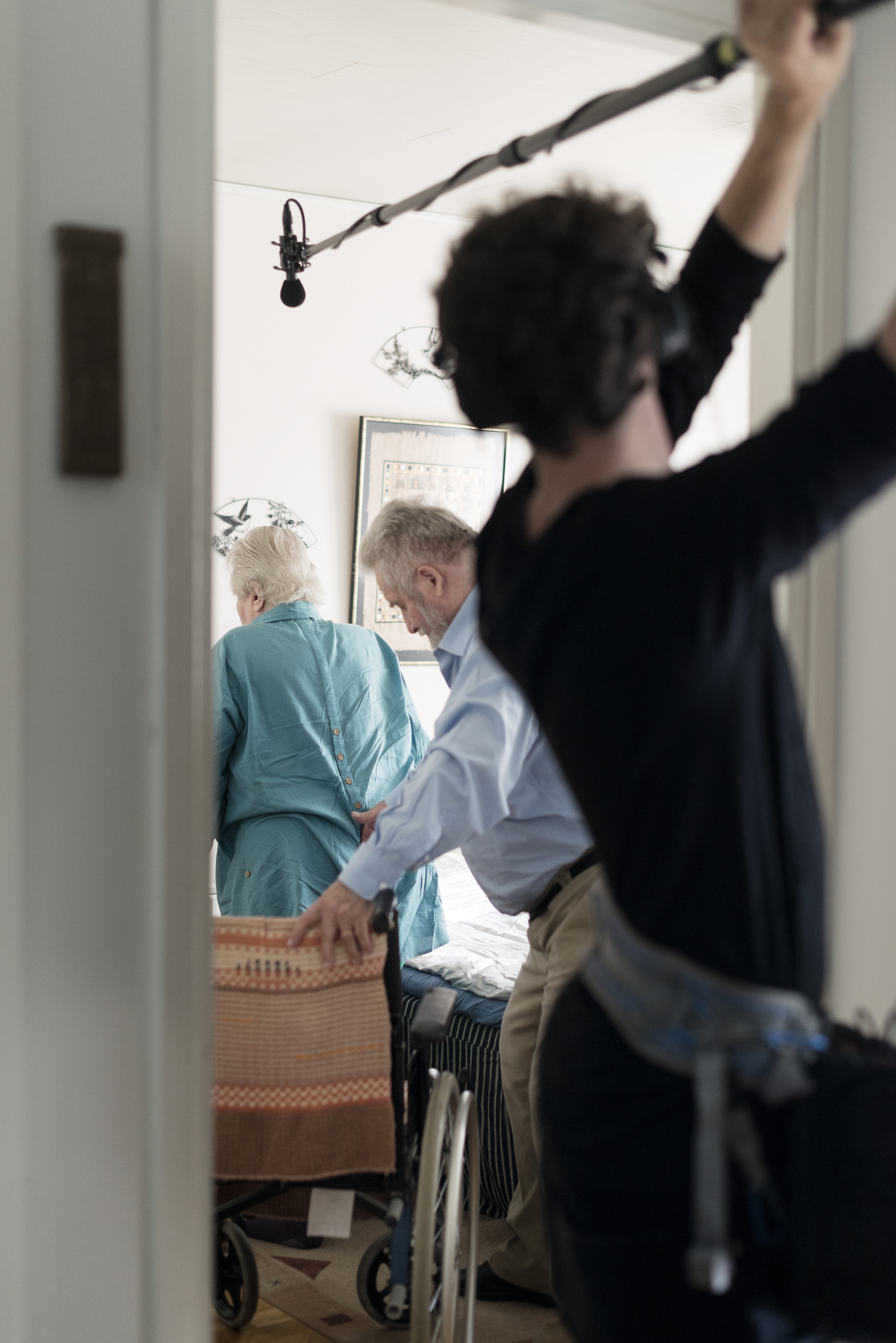 Tuomo työntää Salomen pyörätuolissa kylpyhuoneeseen, Salome katsoo kameroita kummissaan.