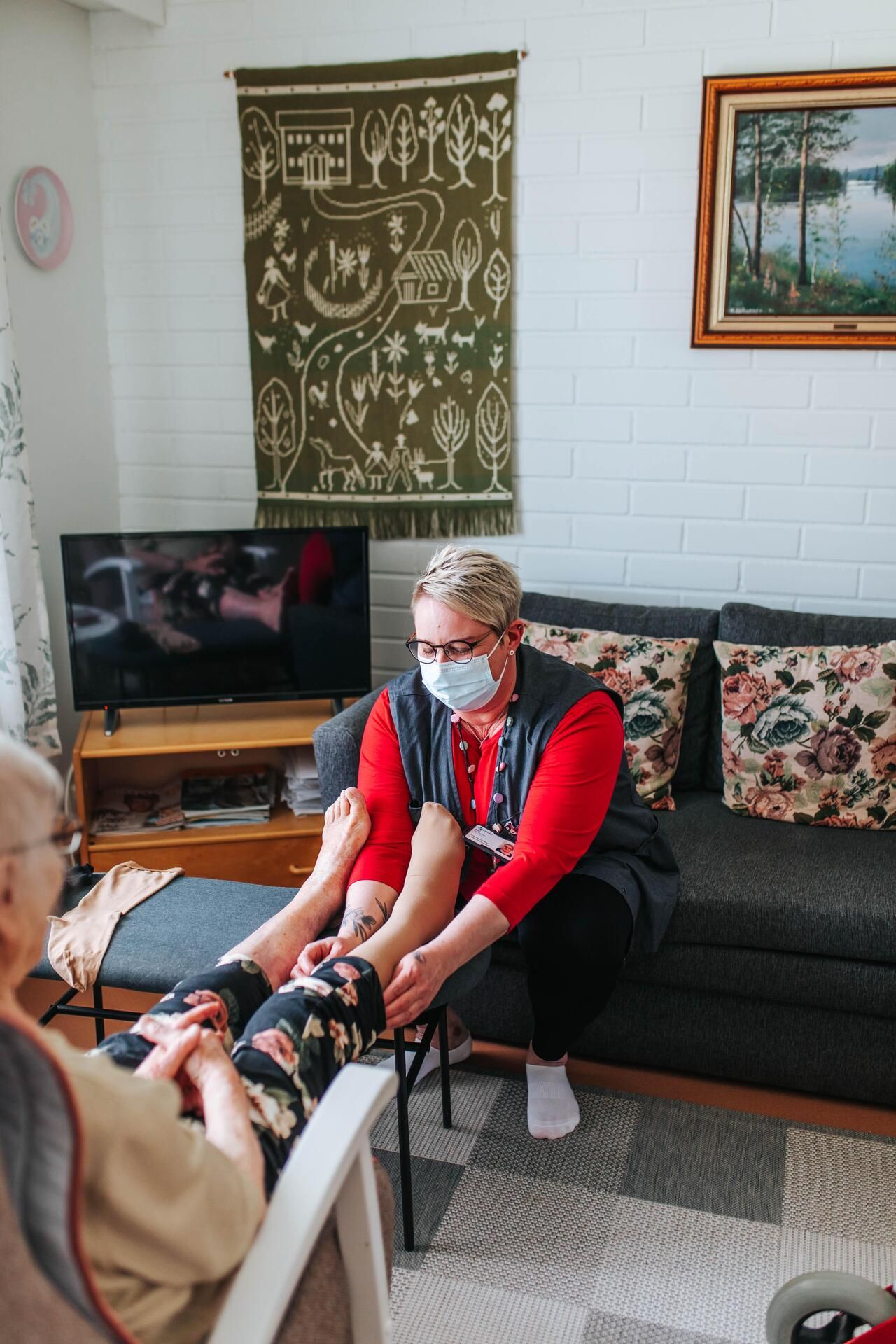 Meillä on monta tukisukka-asiakasta. Sukkia jalkaan auttaessa tulee aina hiki!