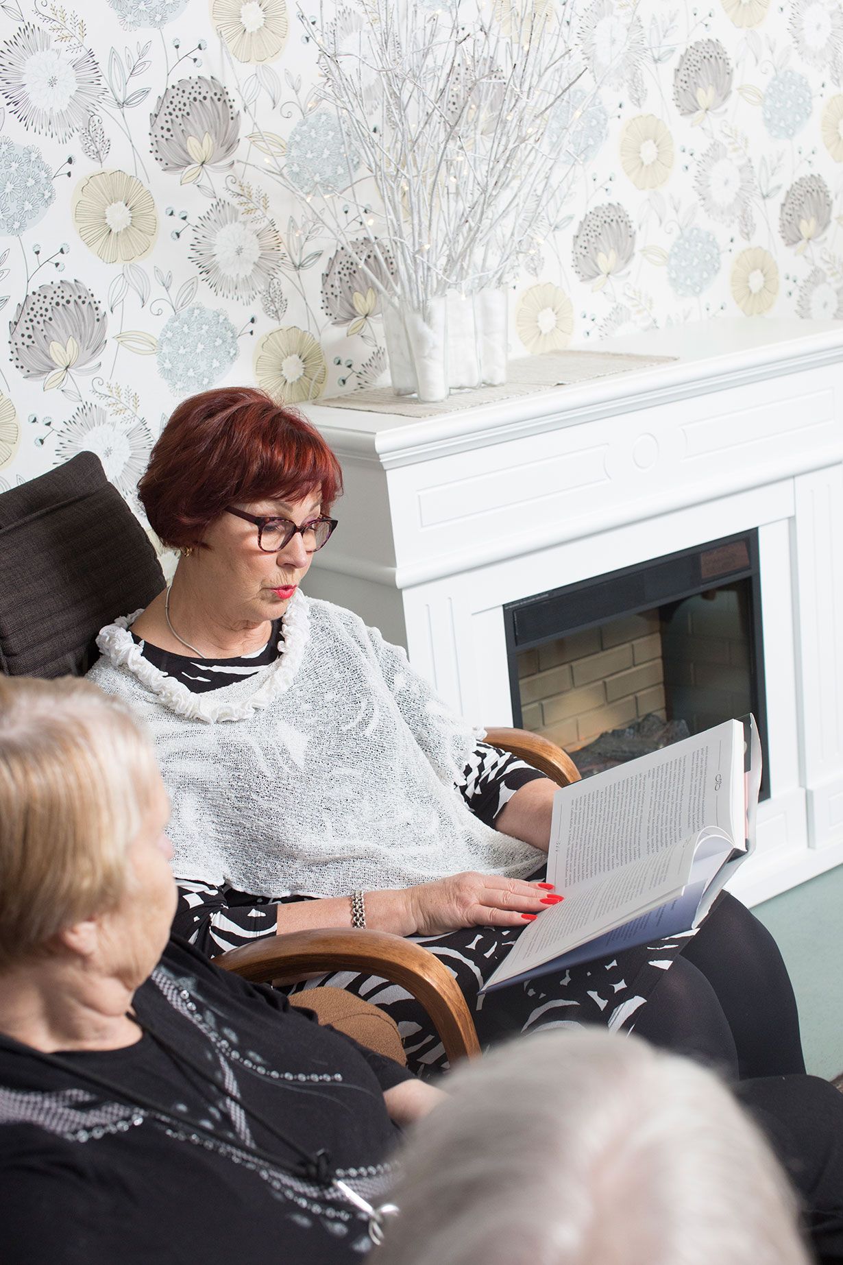 Oululainen Aila Suojanen, 71, on tehnyt neljä vuotta vapaaehtoistyötä Oulun Palvelusäätiön Sara Wacklin -kodissa. Hän lukee talon asukkaille kirjoja, esimerkiksi Pauliina Rauhalan Taivaslaulua.