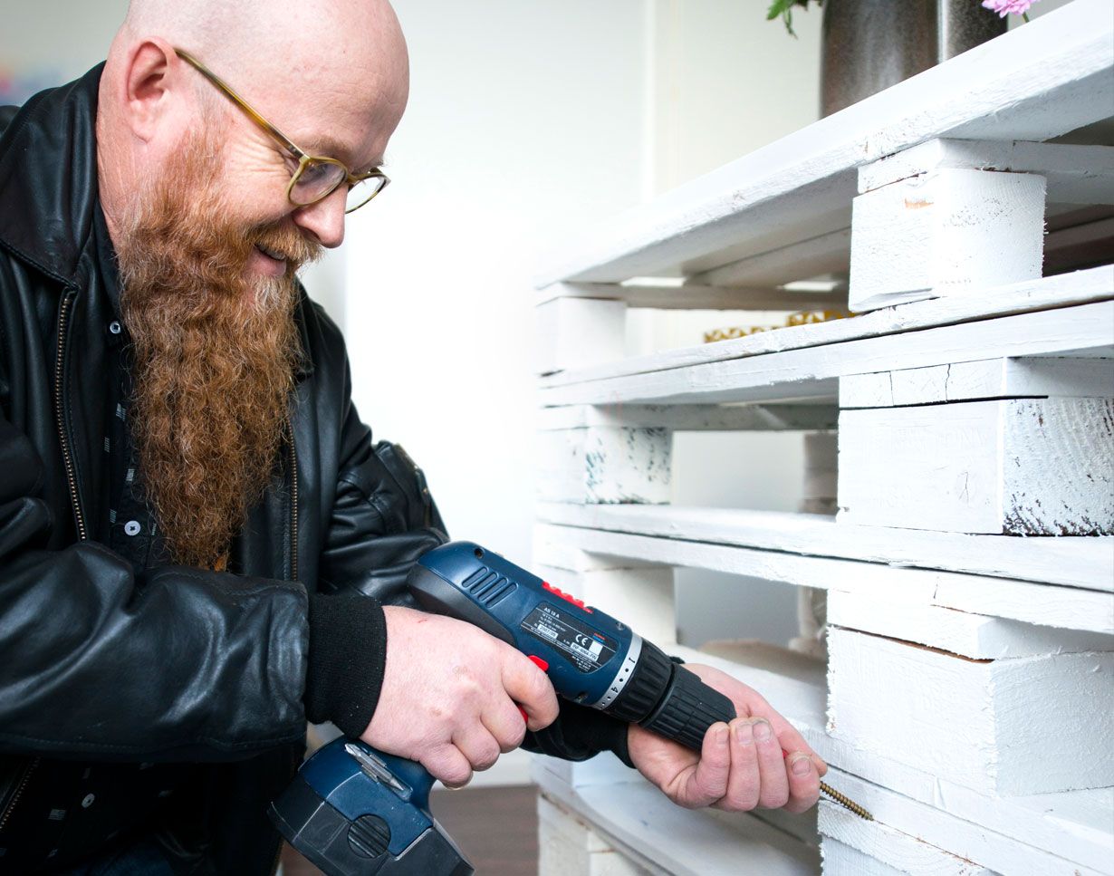 Kun rahaa ei ollut senttiäkään, on pakko olla kekseliäs. Yhdessä maalattiin toistakymmentä eurolavaa valkoisiksi. Niistä tuli iso kulmasohva ja baaritiski keittiöön. Muut huonekalut ja valaisimet löytyivät Haagan ja Kannelmäen kierrätysryhmistä ja roskalavoilta. Vanha muovimatto ei näy, kun lattialla on kerros räsymattoja.