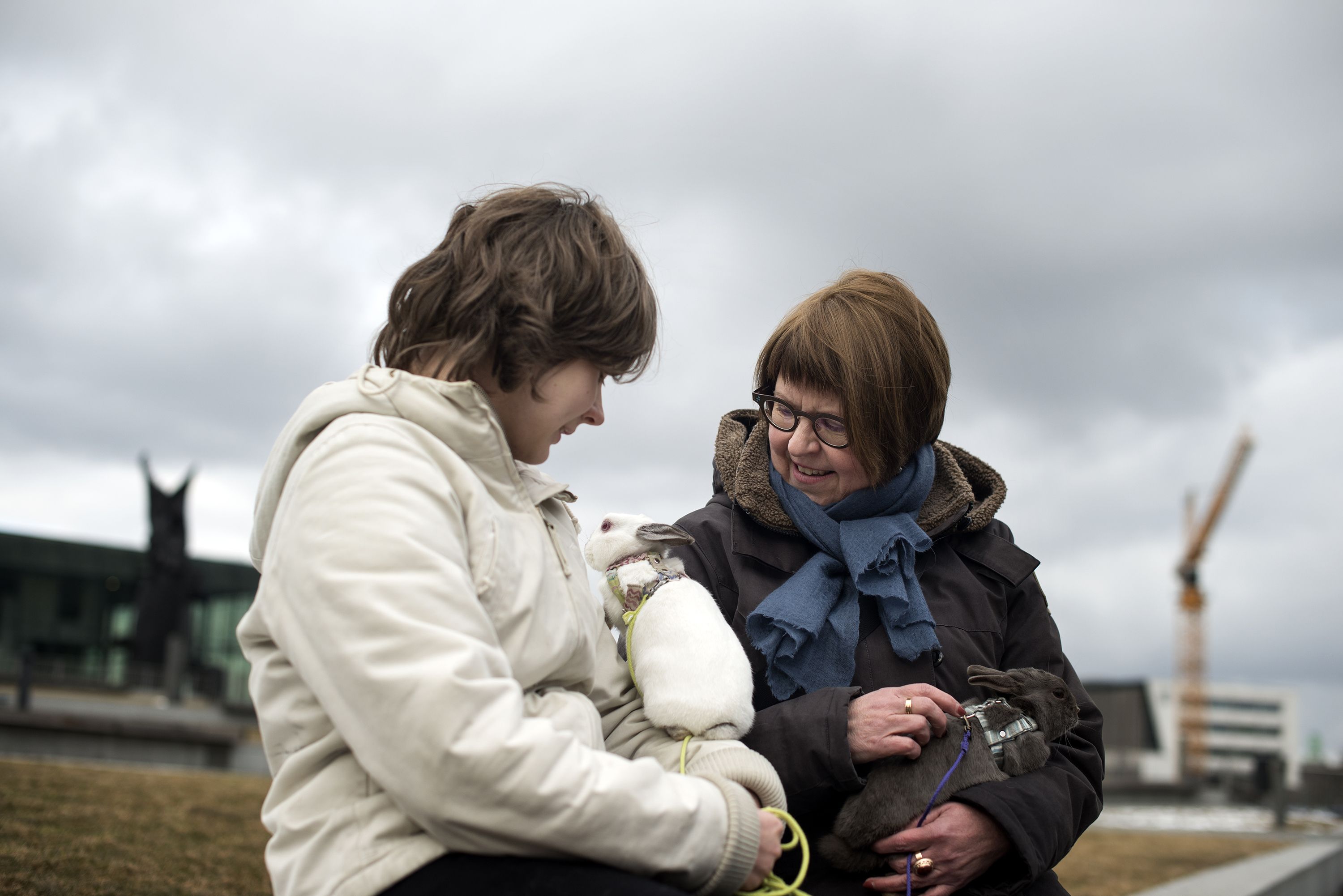 Helsingin Musiikkitalon pihamaalla loikkii kaksi pientä kania. Kääpiöjänikset Virna ja Fio ovat Anastasian kasvattamia pelottomia kanihyppääjiä.